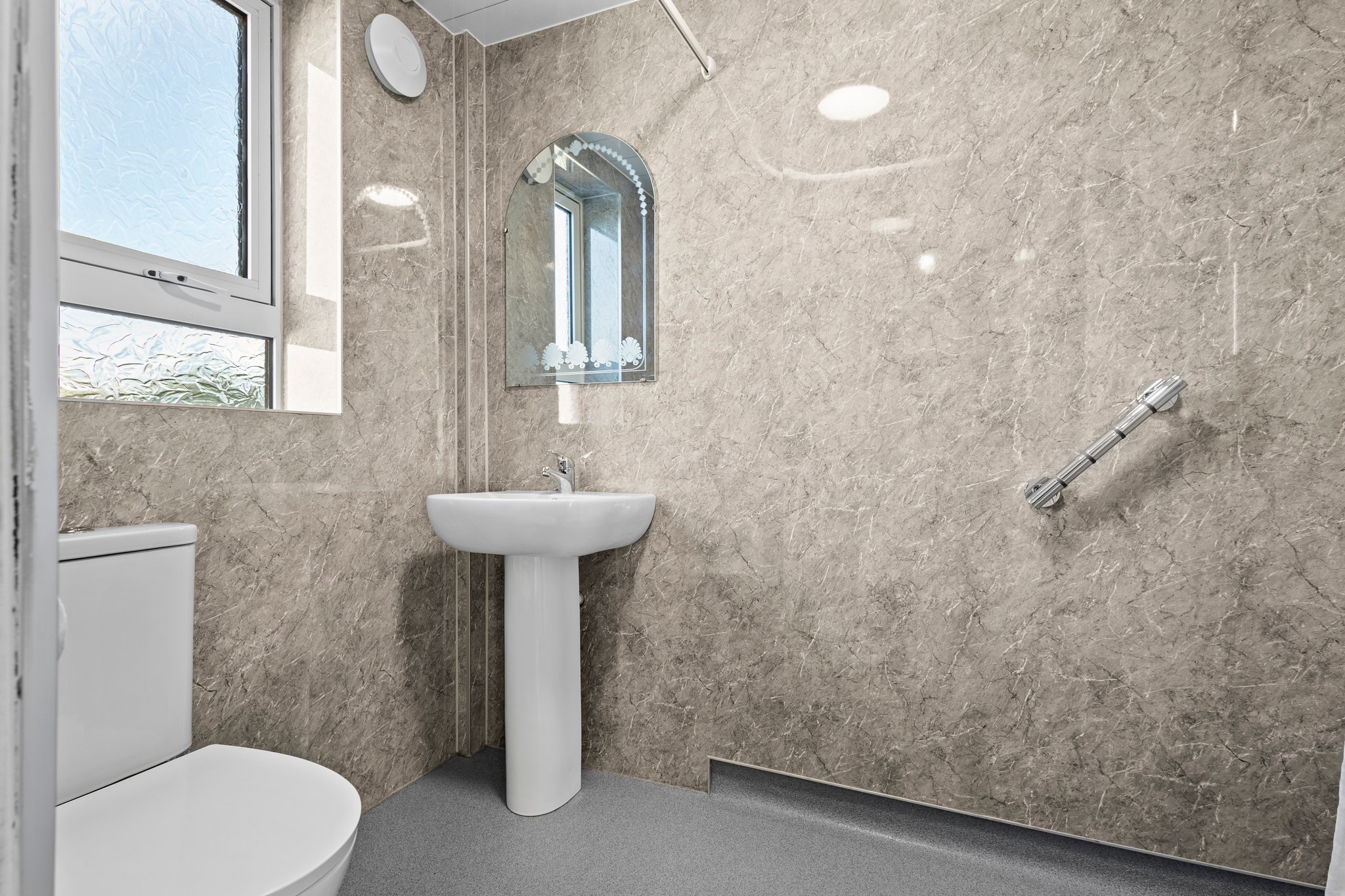 2.26m x 1.56m (7′ 5″ x 5′ 1″) Completing the accommodation is the wet room comprising of a wash hand basin, wc, mains shower, modern wet wall finish, non slip wet room flooring and a double glazed window to the side.