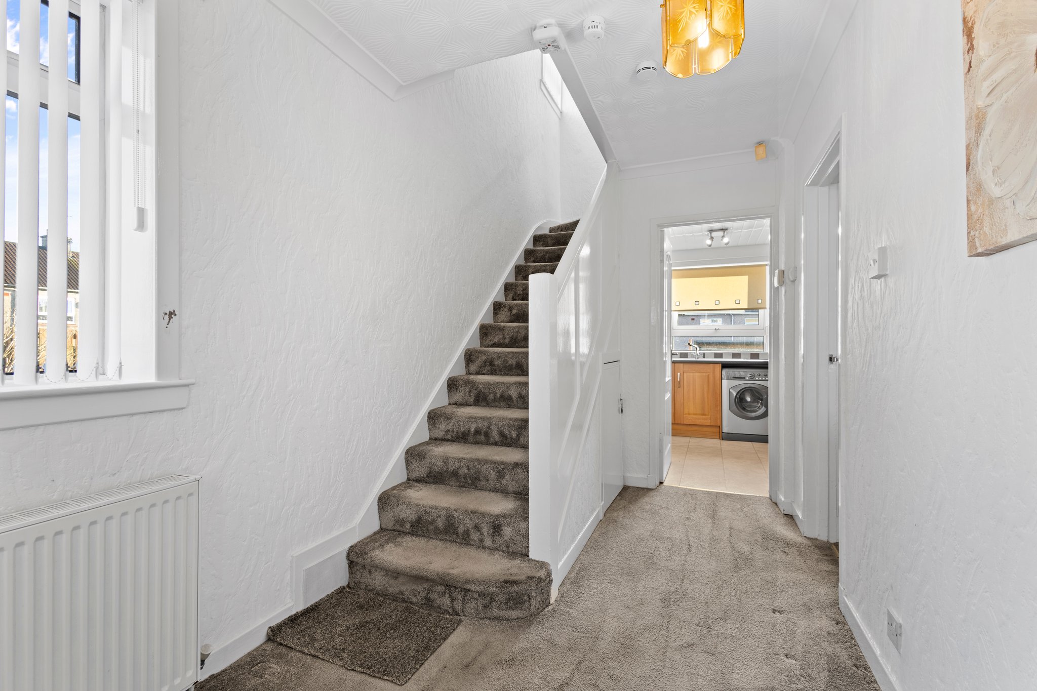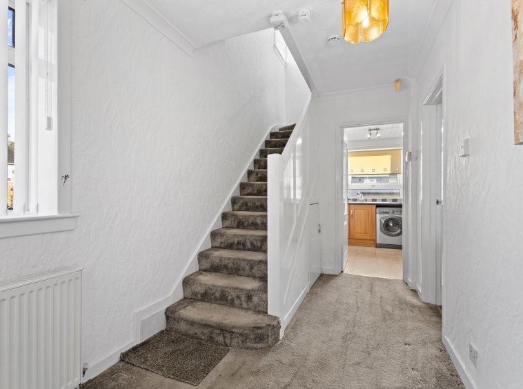 2.04m x 4.12m (6′ 8″ x 13′ 6″) Access is given to a spacious welcoming hallway offering neutral decor, practical understairs storage cupboard, fitted carpet and two double glazed windows to the side. The hallway gives access to the lounge, kitchen and a carpeted staircase leads to the upper level.