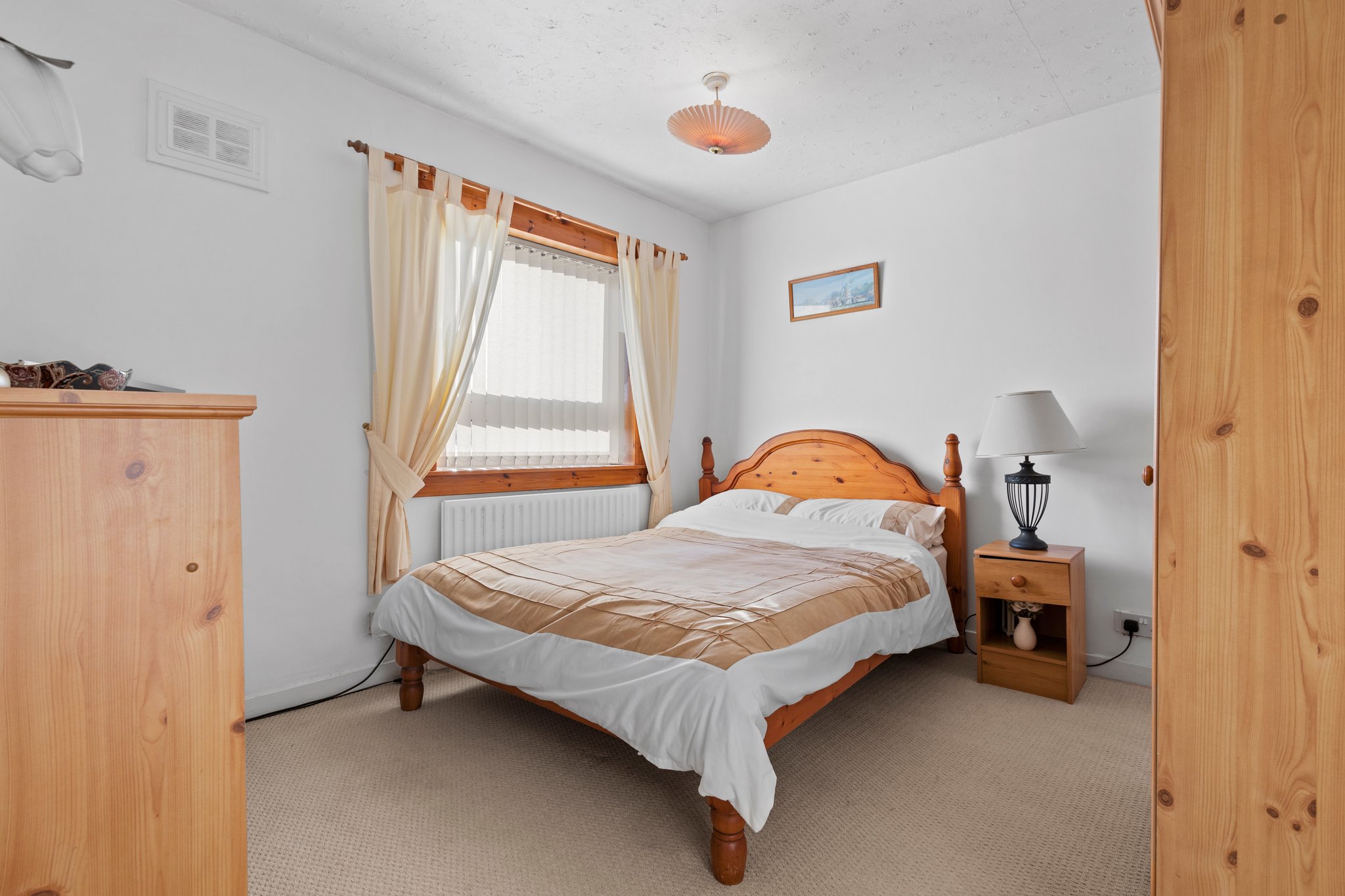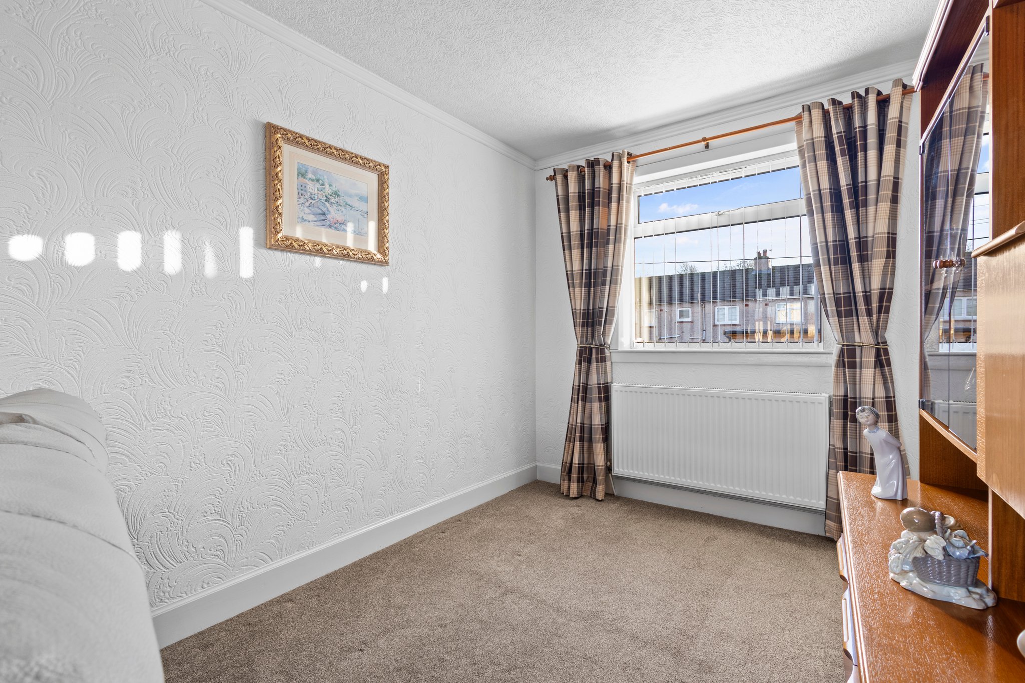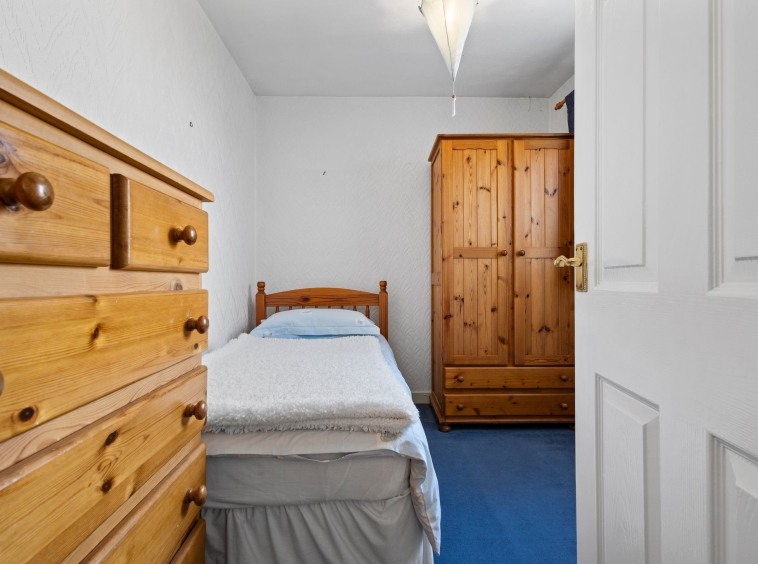 2.26m x 2.93m (7′ 5″ x 9′ 7″) Bedroom three is a spacious bedroom with neutral decor, a practical storage cupboard, fitted carpet and a double glazed window to the side.