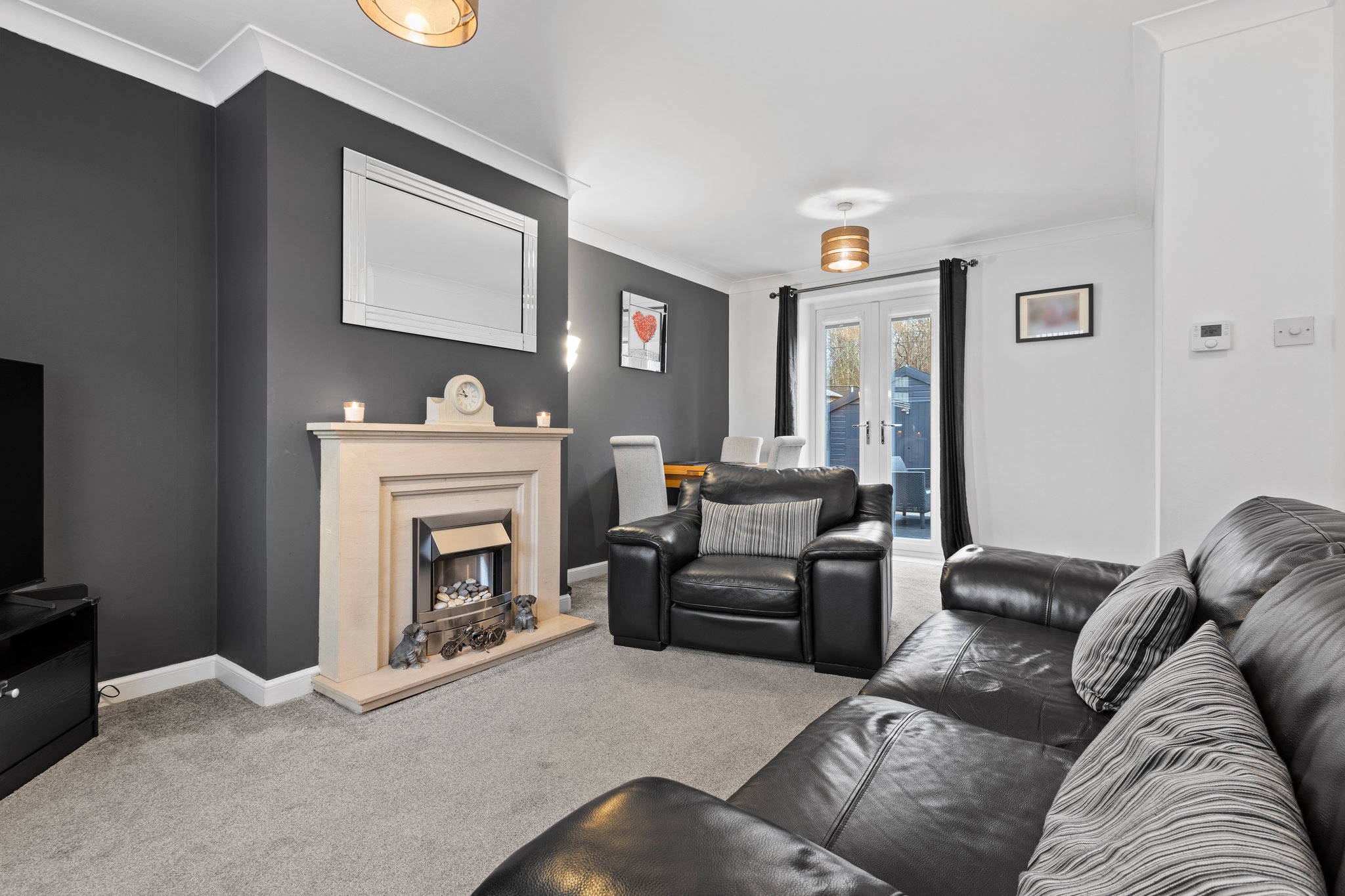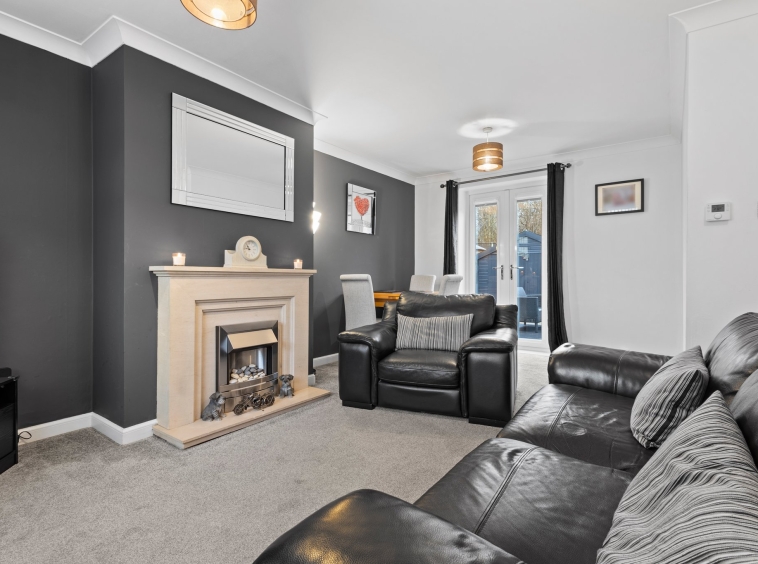 3.49m x 5.66m (11′ 5″ x 18′ 7″) Generous main apartment boasting modern decor, ceiling coving, fitted carpet, feature electric fireplace, ample space for dining table and chairs, double glazed window to the front, double glazed french doors leading to the back garden.