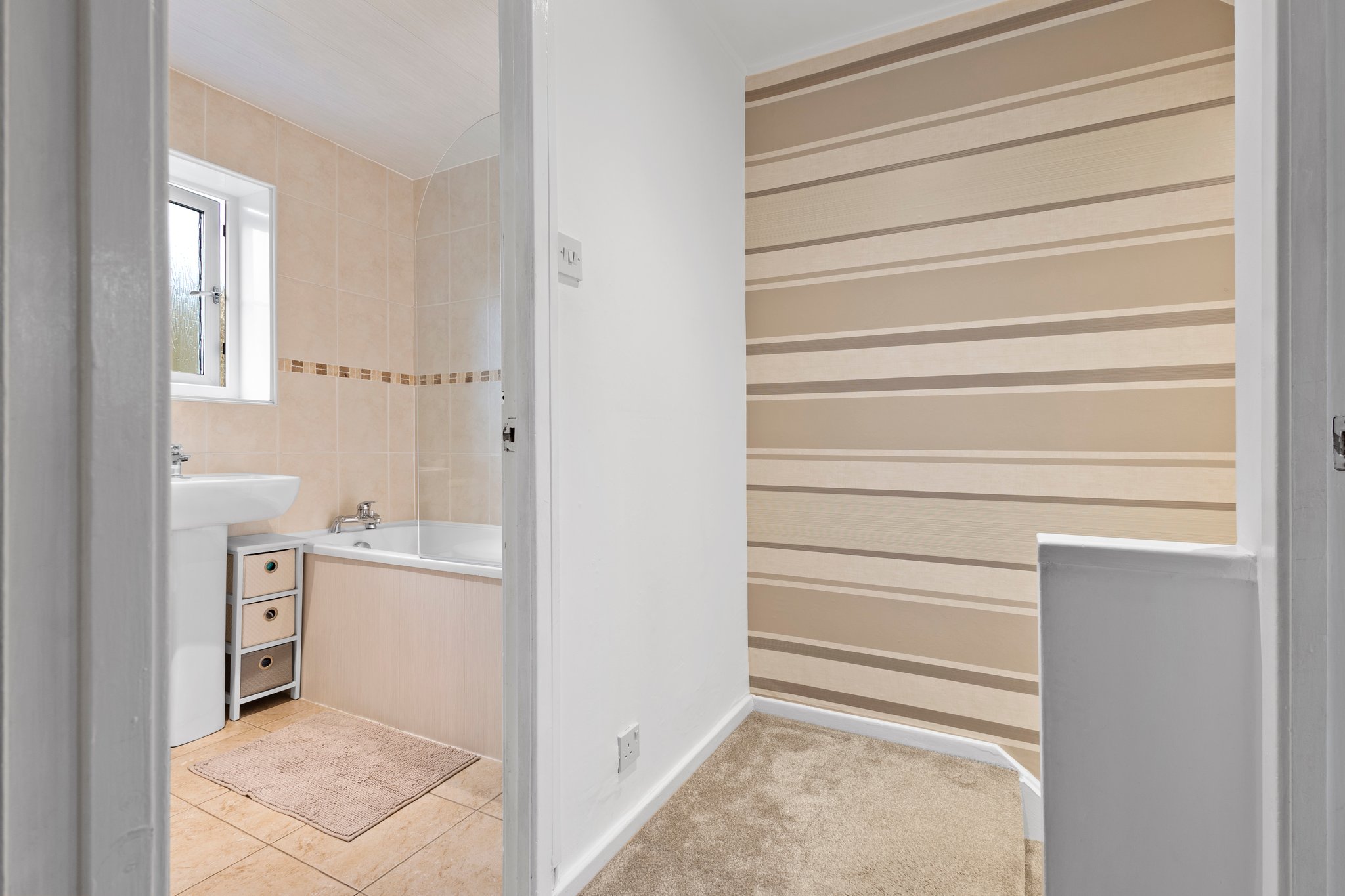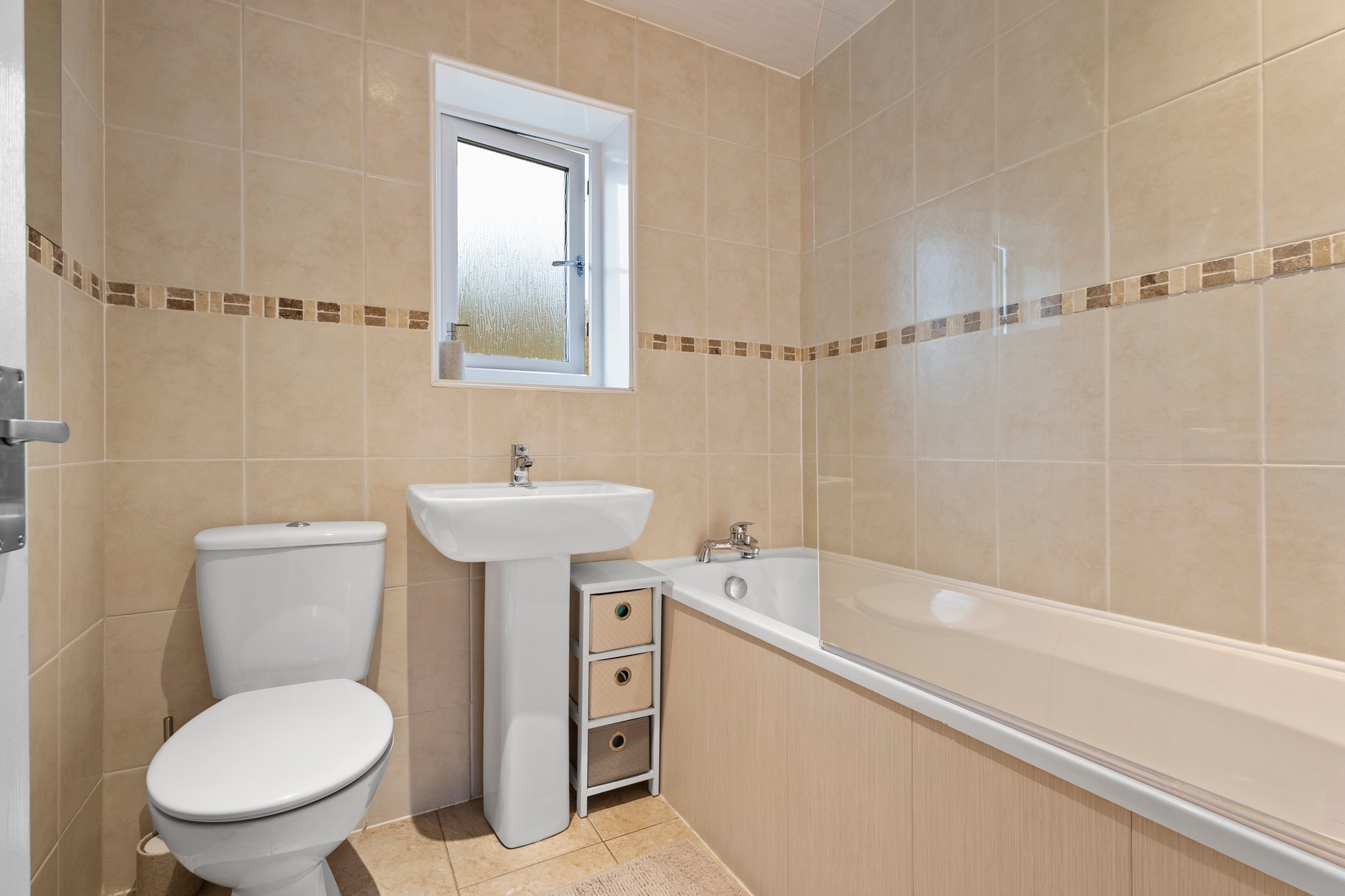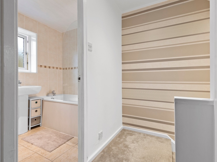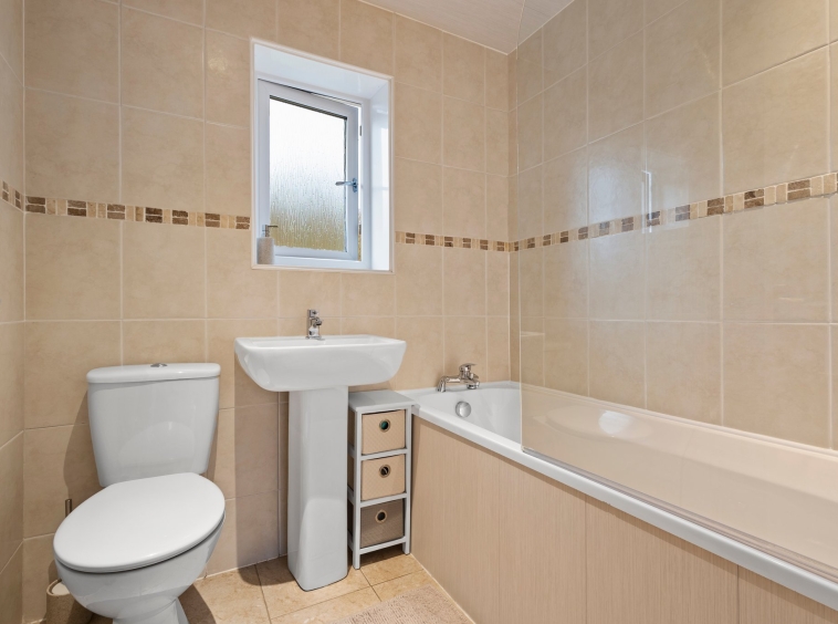 1.99m x 1.69m (6′ 6″ x 5′ 7″) Three piece bathroom comprising of WC, Wash hand basin, shower over bath, tiled walls and floor and double glazed opaque window to the rear.