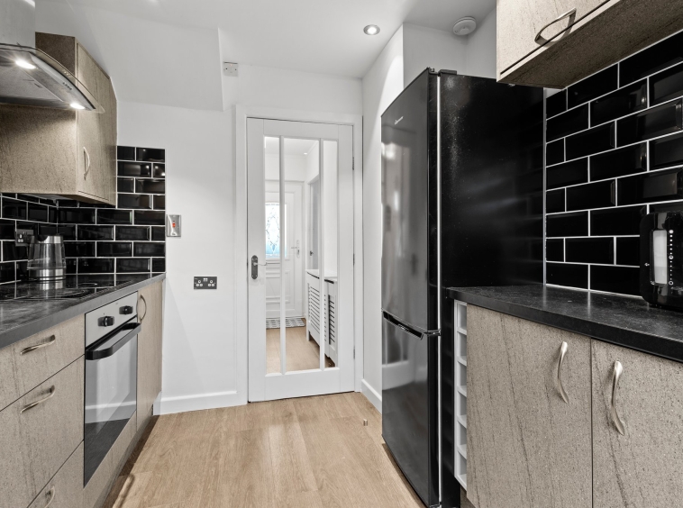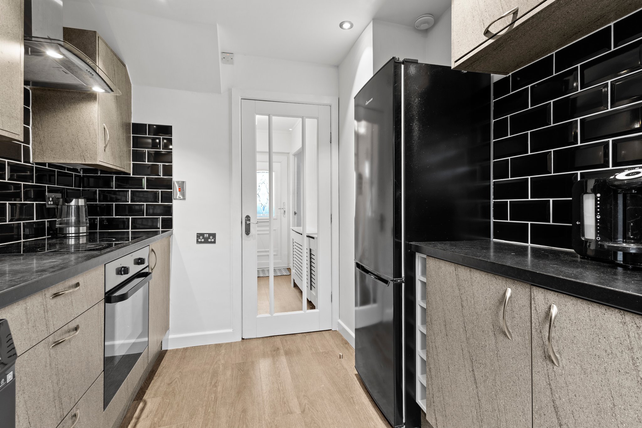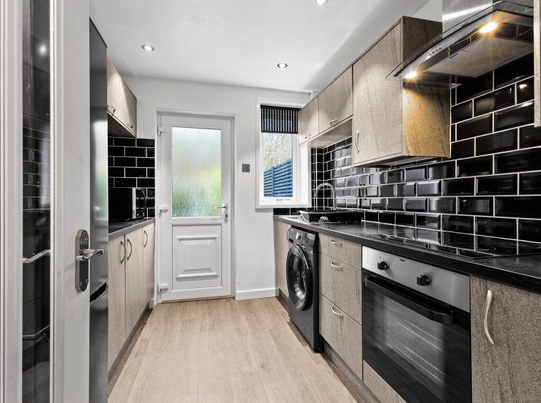 2.38m x 2.88m (7′ 10″ x 9′ 5″) Fully fitted kitchen offering an array of wall and base units, contrasting anthracite work surfaces, stylish charcoal metro style tiles to the wall, ceiling spotlights, integrated electric hob and oven, cooker hood, plumbing space for washing machine and fridge freezer, stainless steel sink and drainer, laminate flooring, double glazed window to the rear and external UPVC opaque glazed door to the rear.
