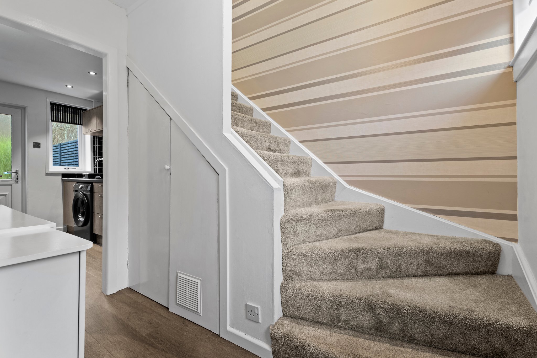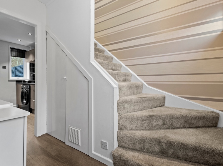 Accessed via the outer UPVC door, welcoming hallway with neutral decor, laminate flooring, carpeted staircase, under stair storage, door access to the living room and kitchen.