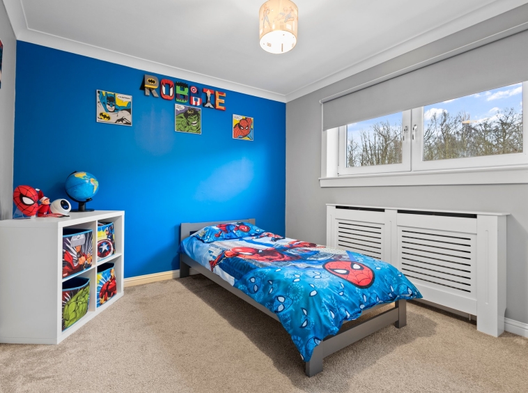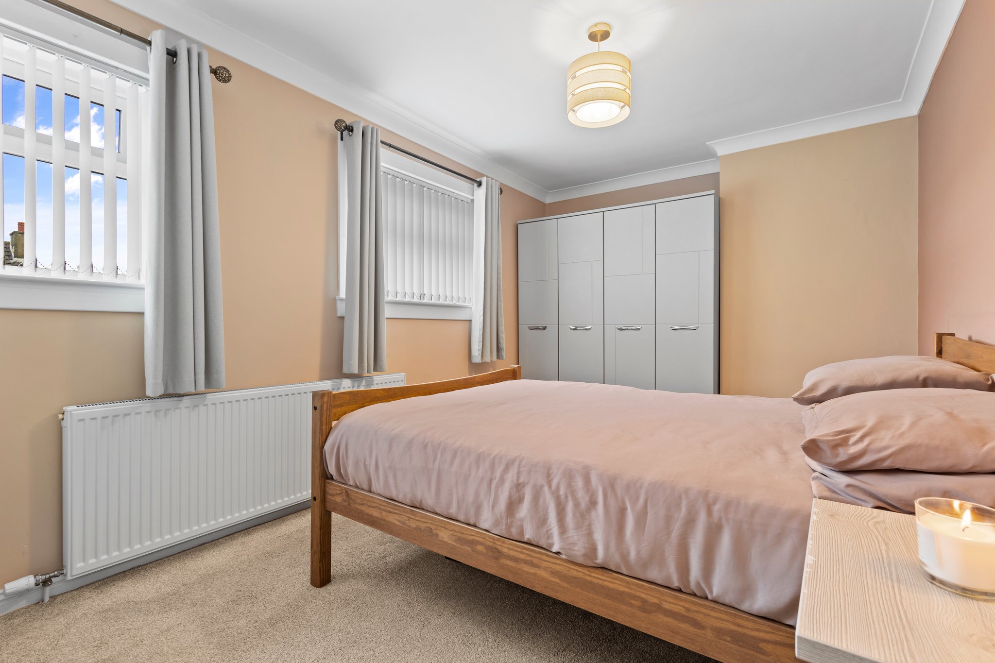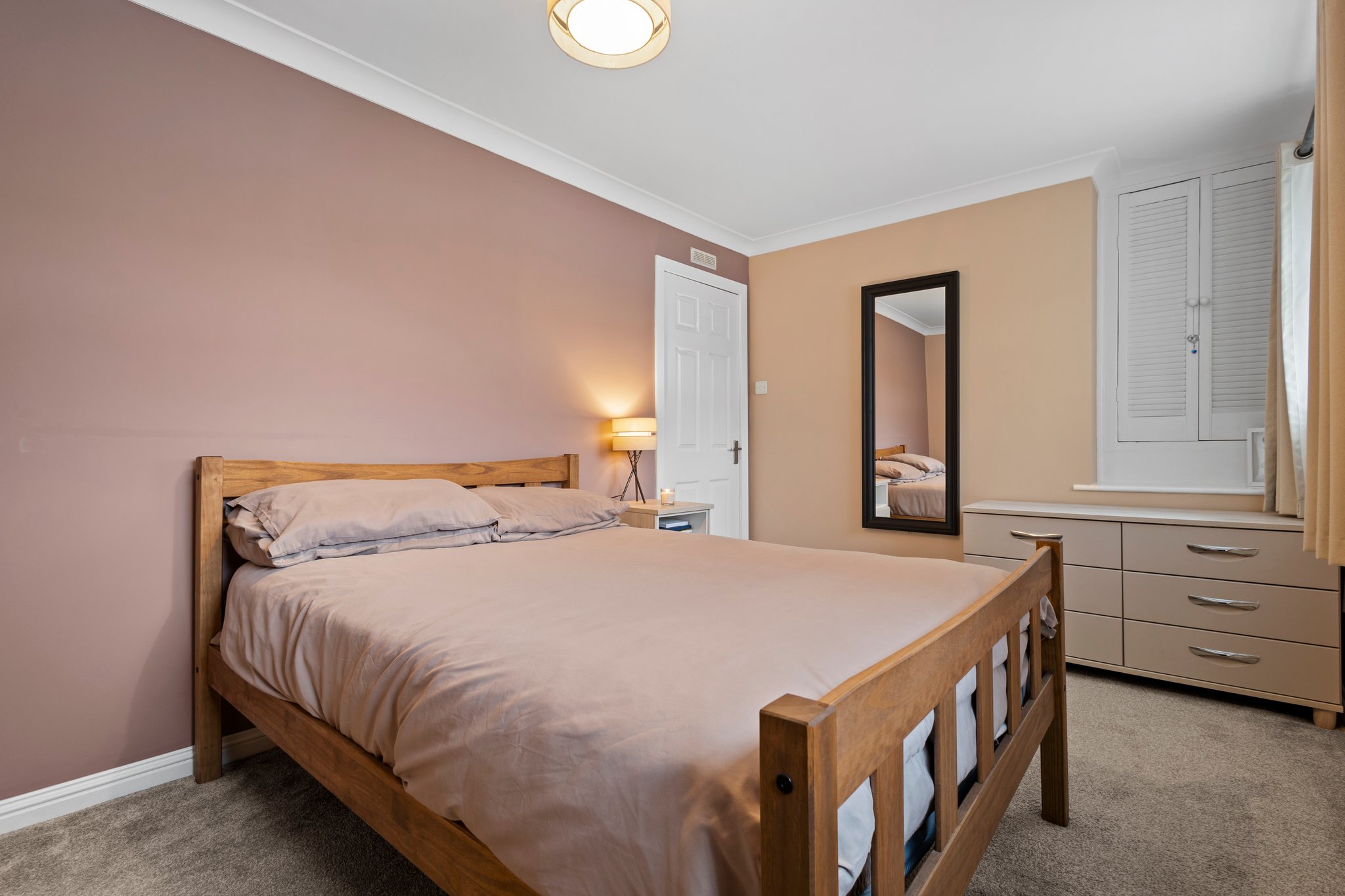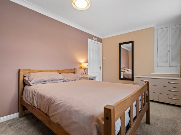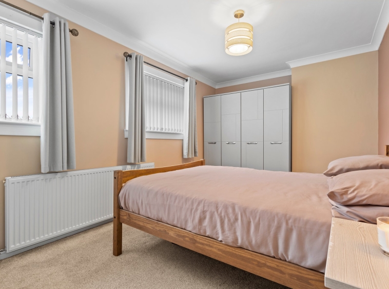 4.74m x 2.68m (15′ 7″ x 8′ 10″) Double bedroom featuring soft decor, celing coving, fitted carpet, storage cupboard and two double glazed windows to the front.