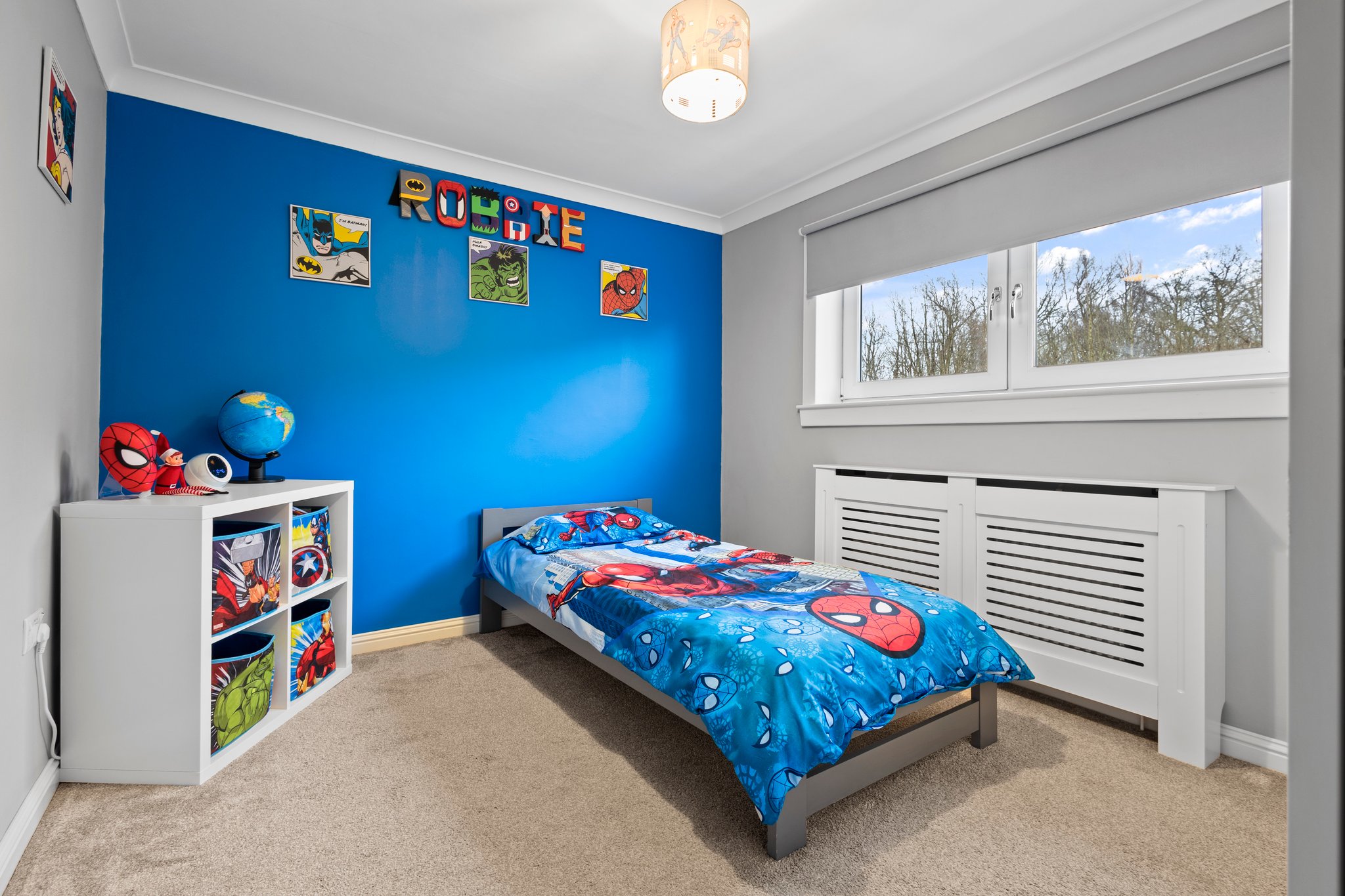 3.49m x 2.88m (11′ 5″ x 9′ 5″) Double bedroom featuring modern decor, ceiling coving, fitted carpet, storage cupboard and double glazed window to the rear.