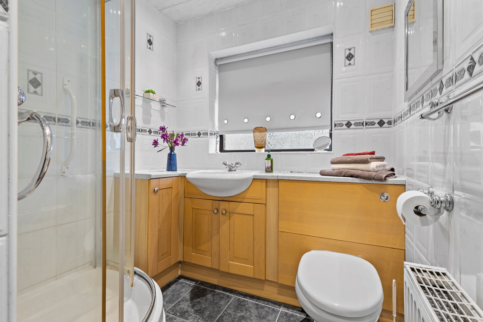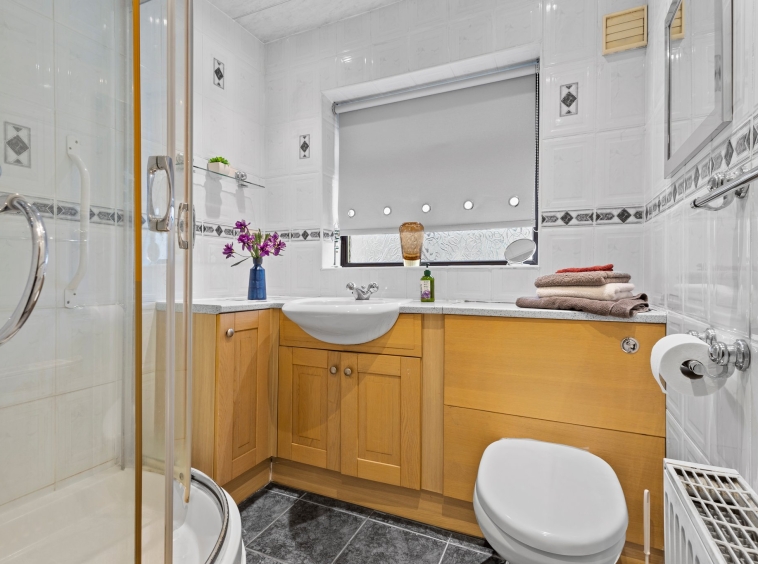 1.88m x 2.24m (6′ 2″ x 7′ 4″) Completing the accommodation is the family bathroom comprising of a wash hand basin with vanity storage, wc, shower cubicle with mains shower, fully tiled finish to walls, ceiling spotlights, tiled flooring and a double glazed window to the side.