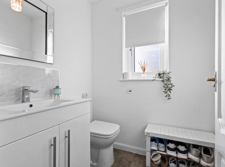 1.48m x 1.08m (4′ 10″ x 3′ 7″) Practical wc comprising of a wash hand basin with vanity storage, wc, modern decor, LVT flooring and a double glazed window to the front.