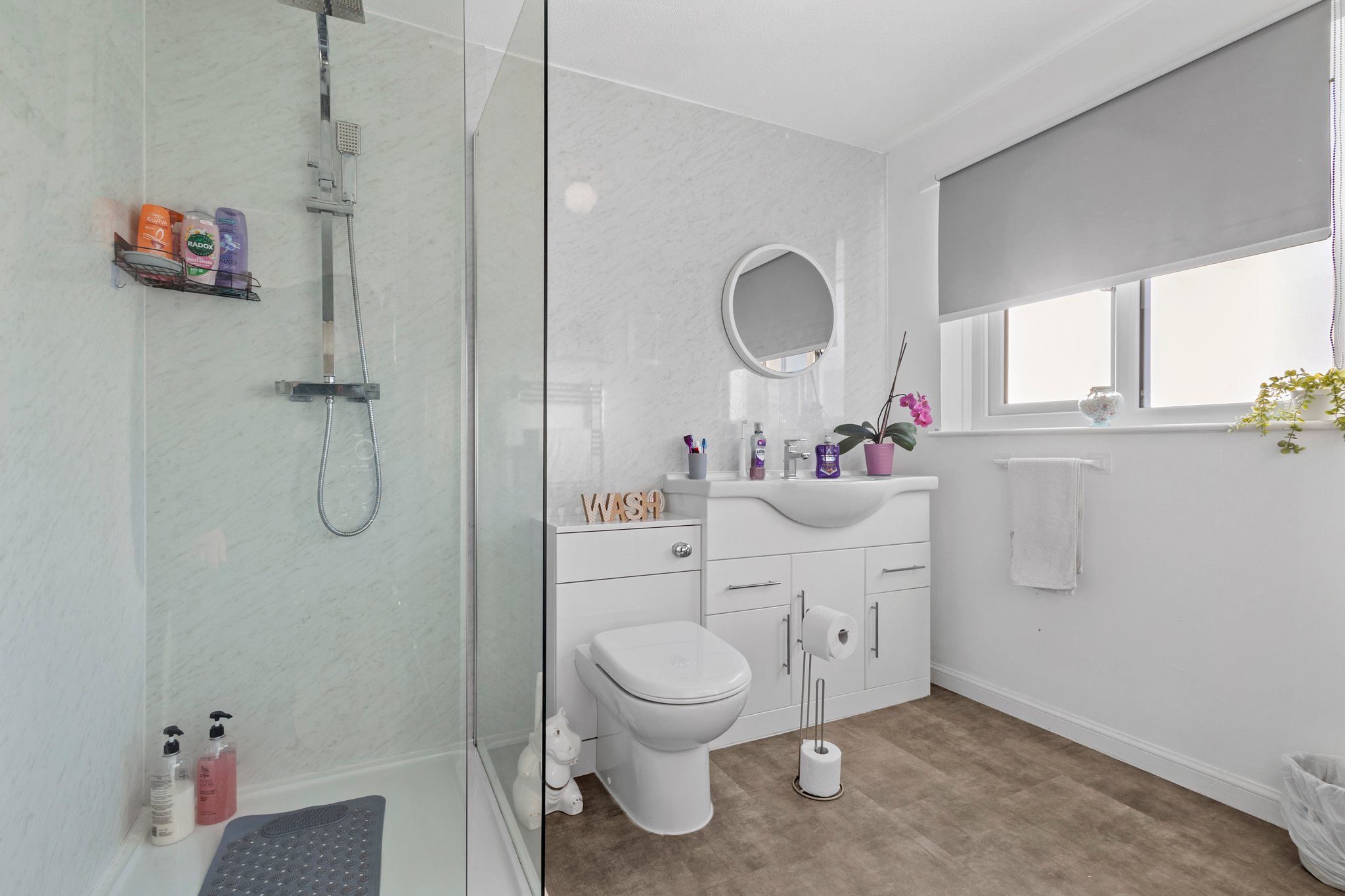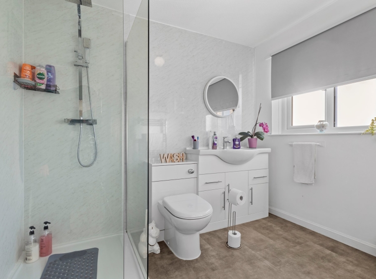 2.67m x 3.28m (8′ 9″ x 10′ 9″) Stylish en-suite comprising of a wash hand basin, vanity unit, wc, shower cubicle with mains shower, neutral decor, wet wall finish in shower, towel rail, practical storage cupboard, LVT flooring and a double glazed window to the front.