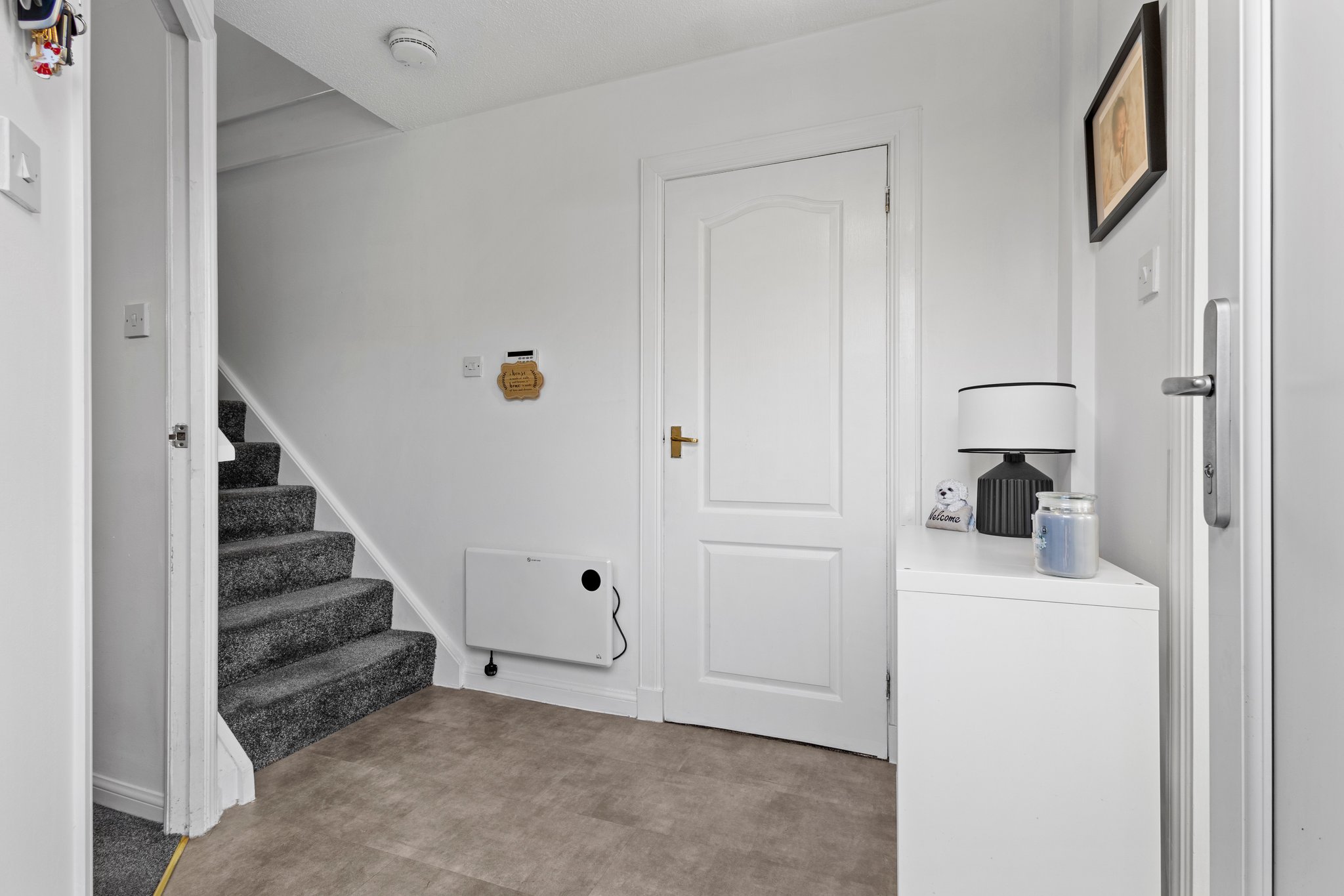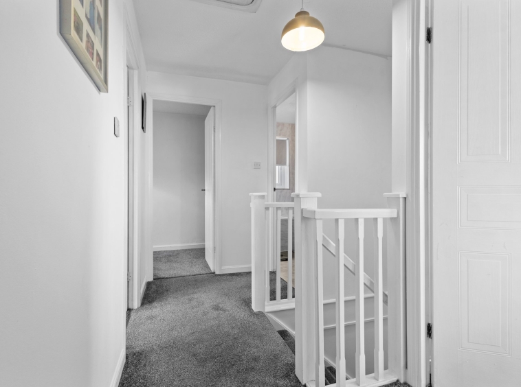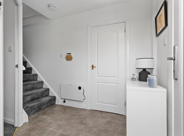 2.30m x 1.99m (7′ 7″ x 6′ 6″) Access is given to a welcoming spacious hallway offering neutral decor and LVT flooring. The hallway gives access to the lounge, kitchen, wc and a carpeted staircase leads to the upper level.