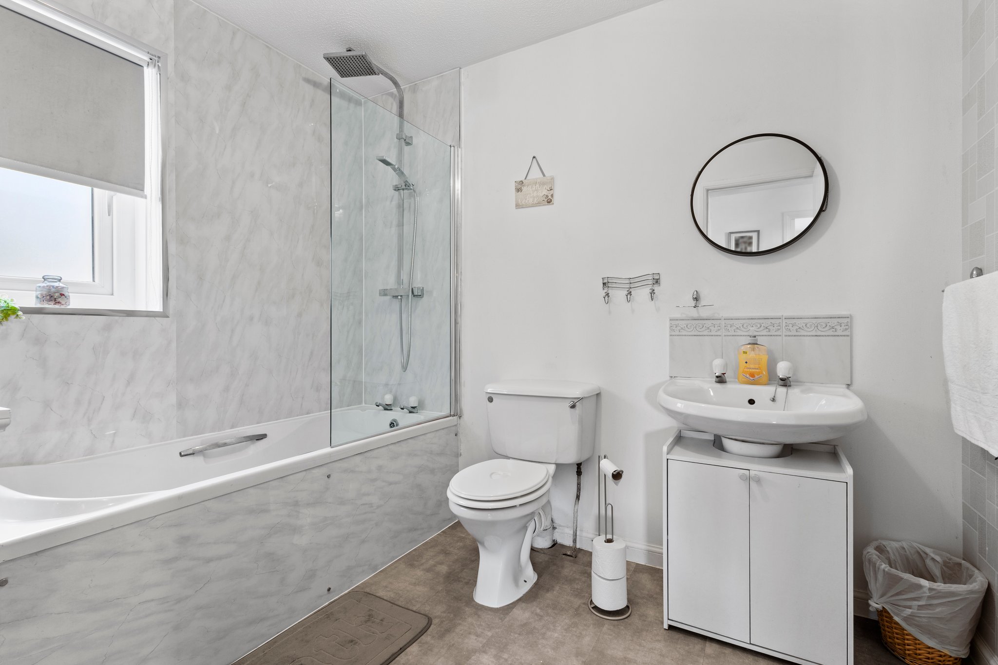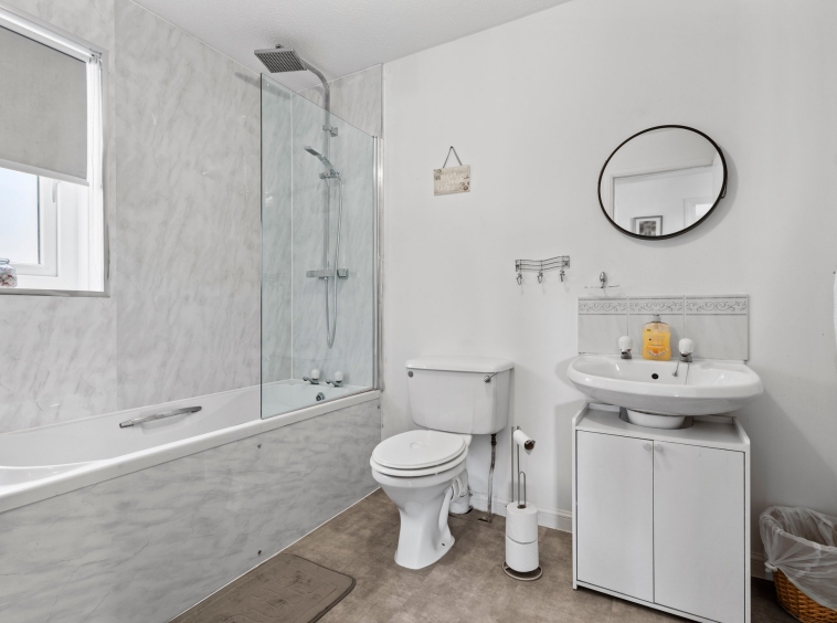 2.02m x 2.55m (6′ 8″ x 8′ 4″) Completing the accommodation is the family bathroom comprising of a wash hand basin, wc, bath with overhead shower, heated towel rail, modern decor, wet wall finish, LVT flooring and a double glazed window to the side.
