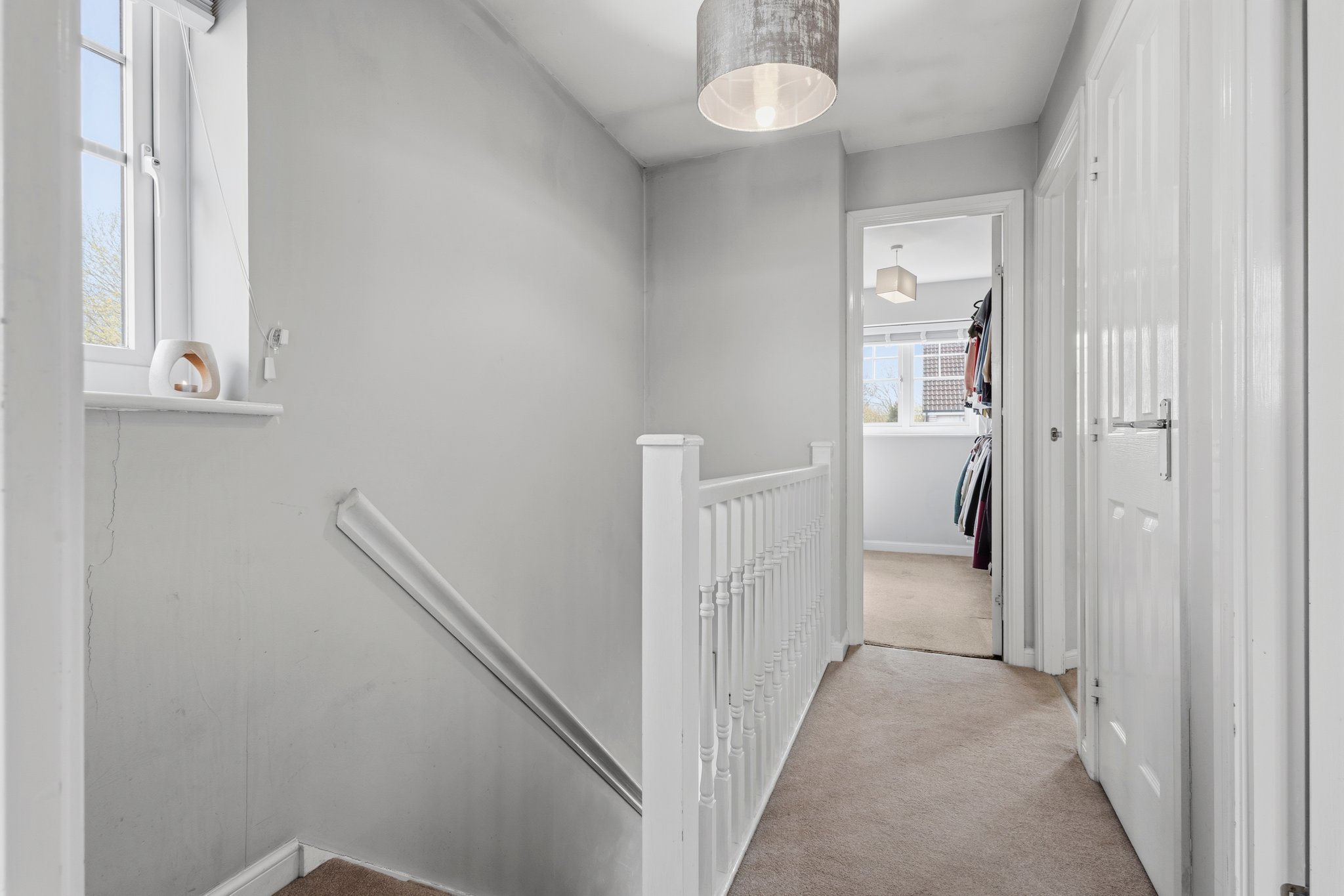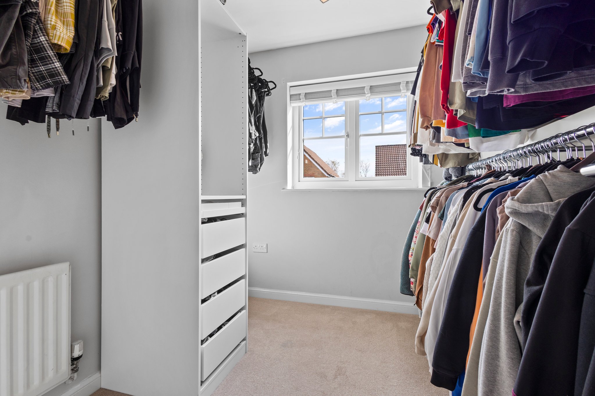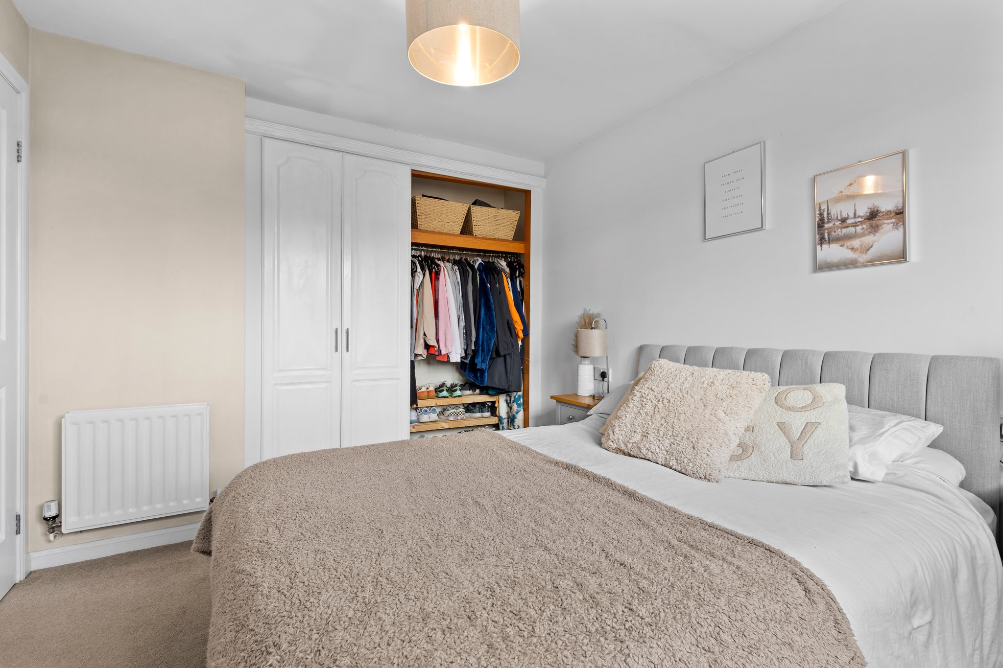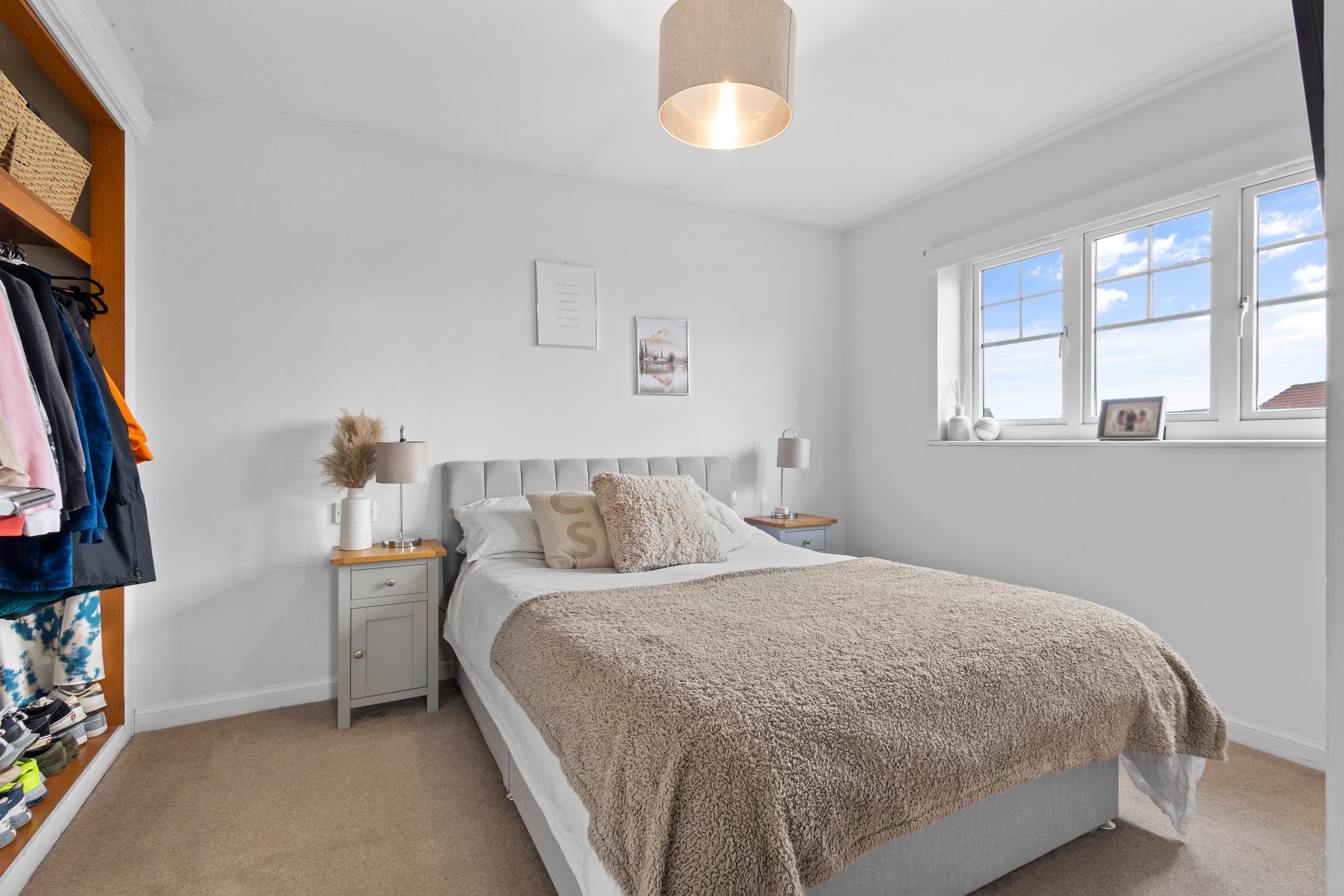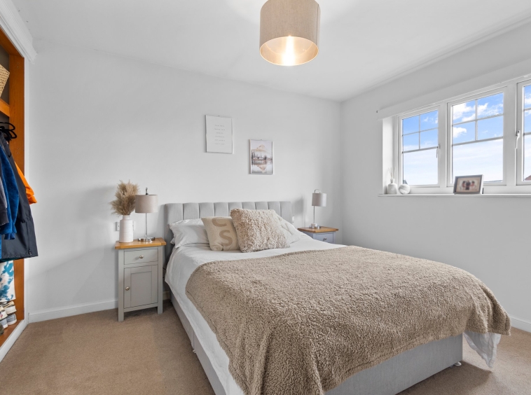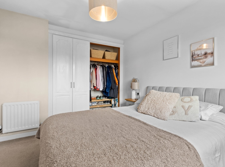 3.49m x 2.85m (11′ 5″ x 9′ 4″) The master bedroom is a generous double boasting crisp white decor, fitted storage cupboard with additional hanging and shelved storage, fitted carpet and a large double glazed window to the rear.