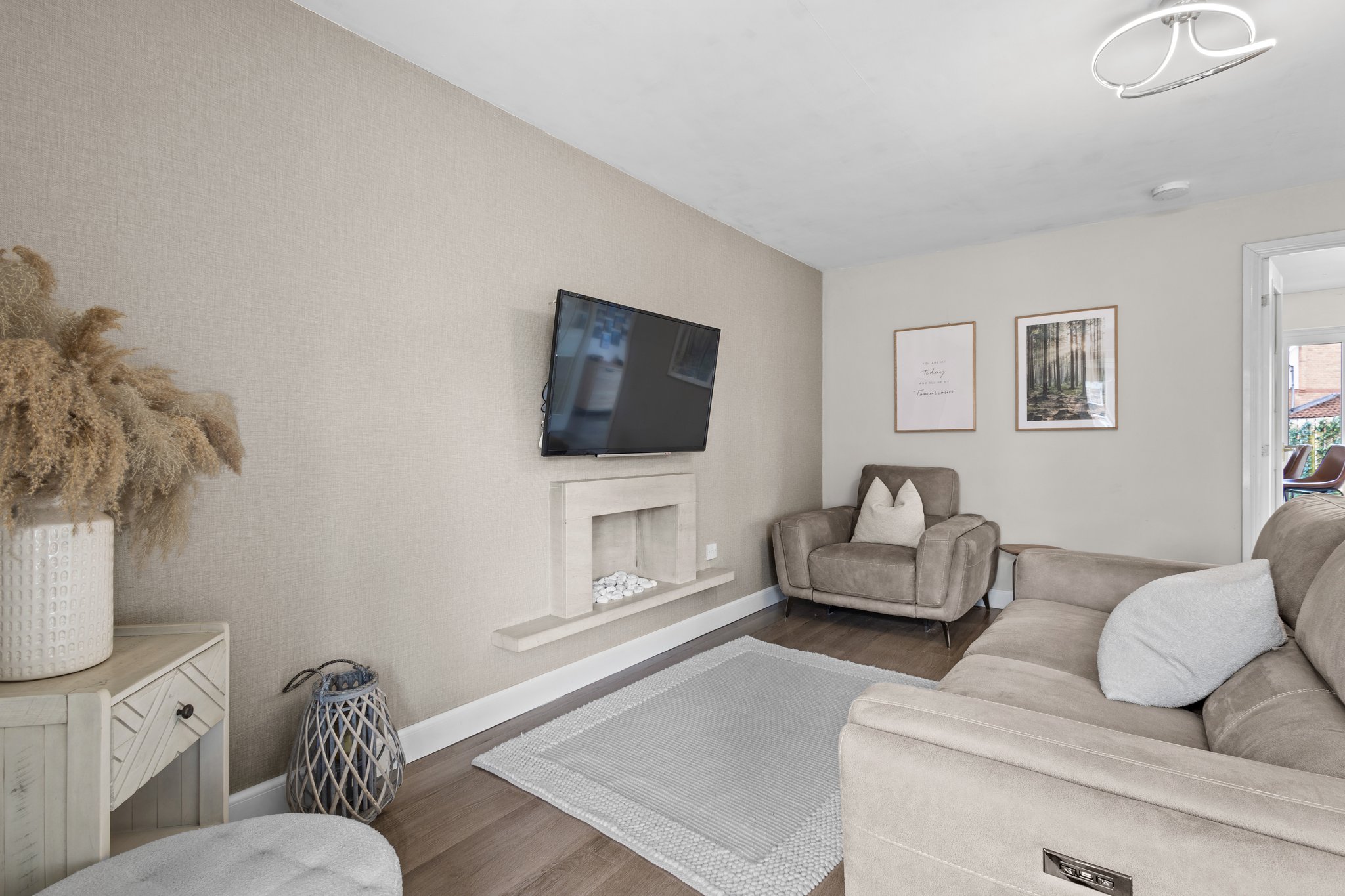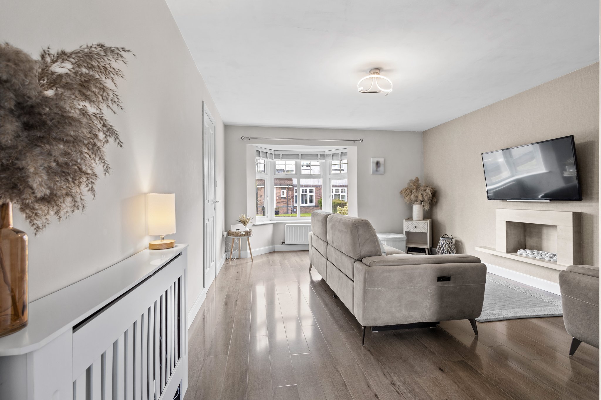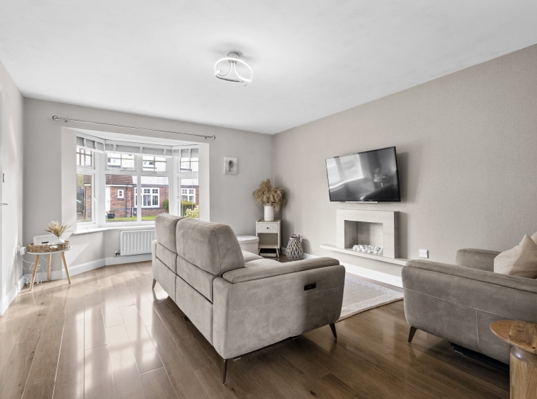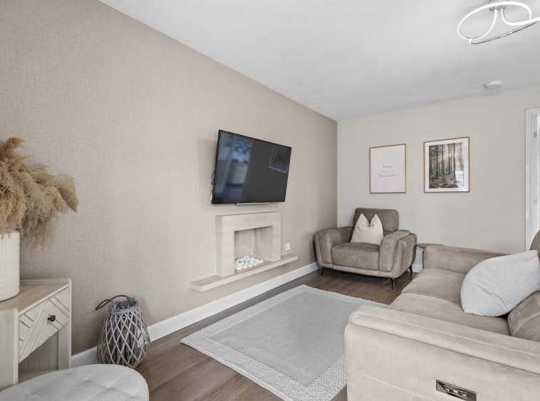 Generously proportioned main apartment boasting stylish neutral decor, a stunning feature fireplace, modern laminate flooring, a large double glazed window to the front and door access to the kitchen