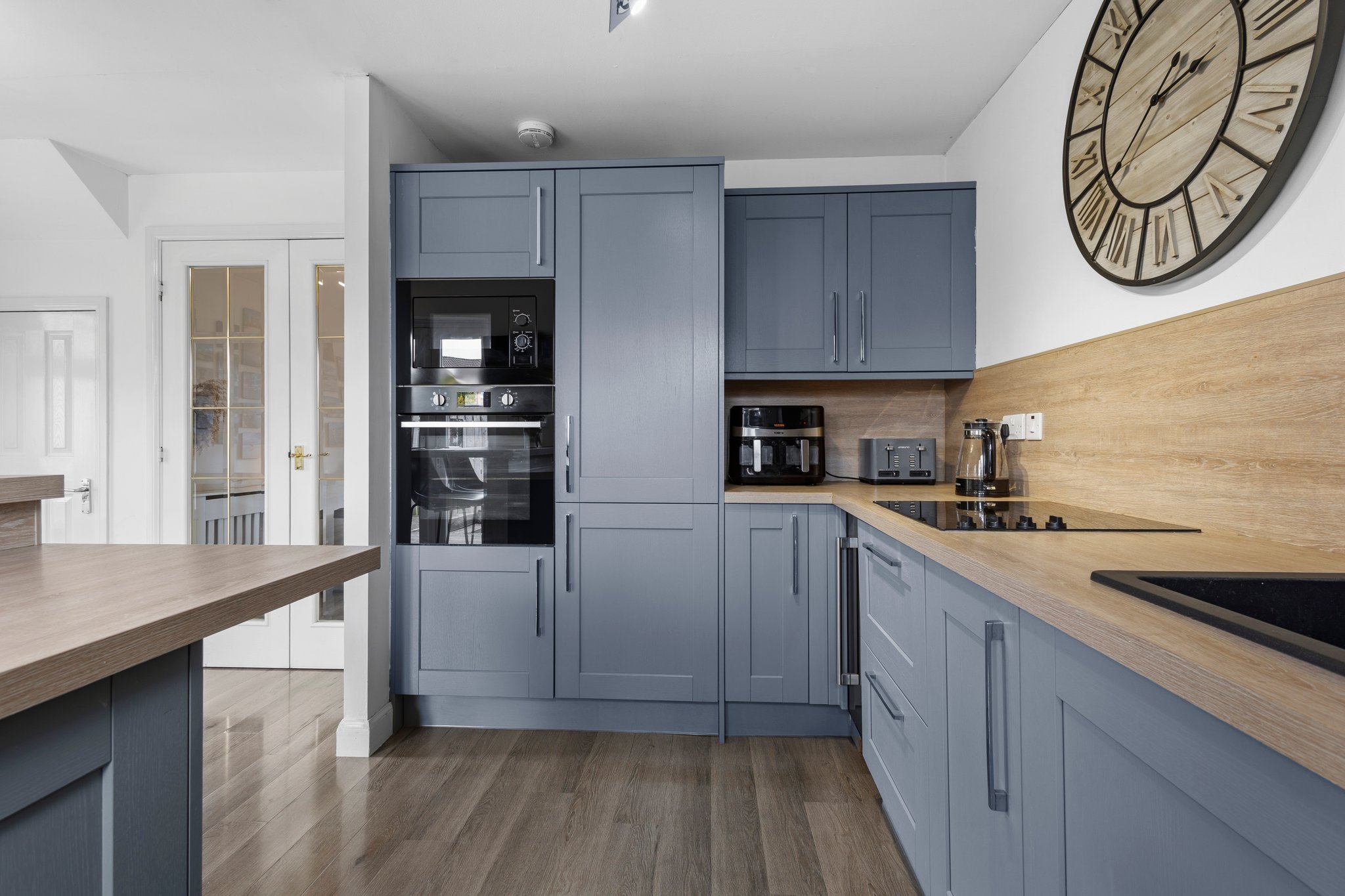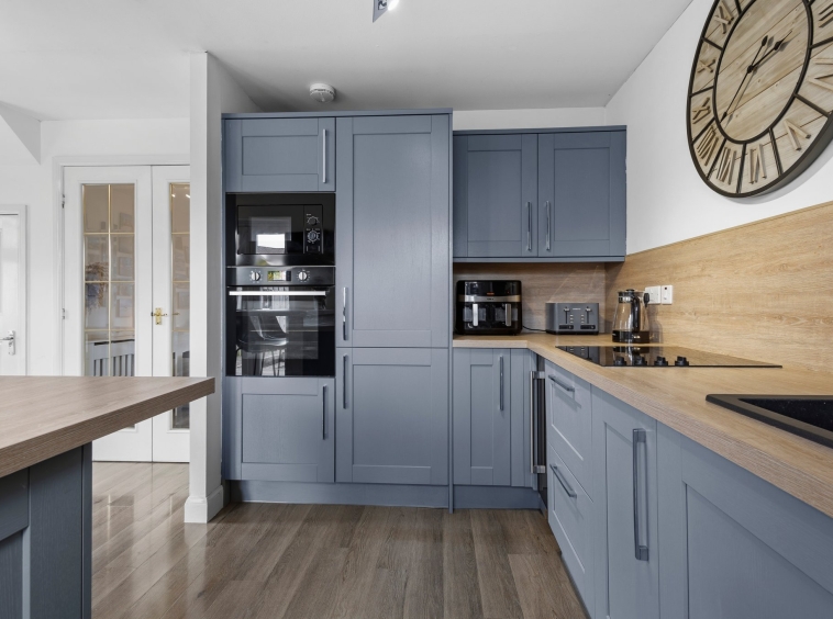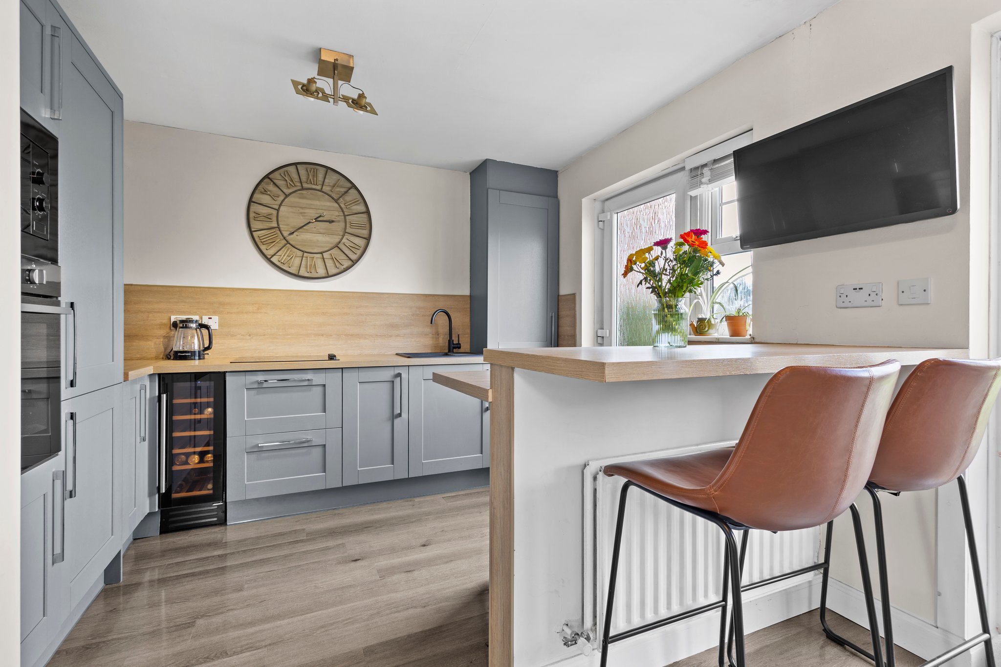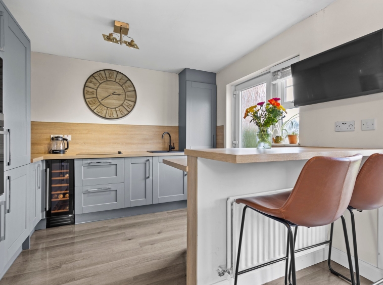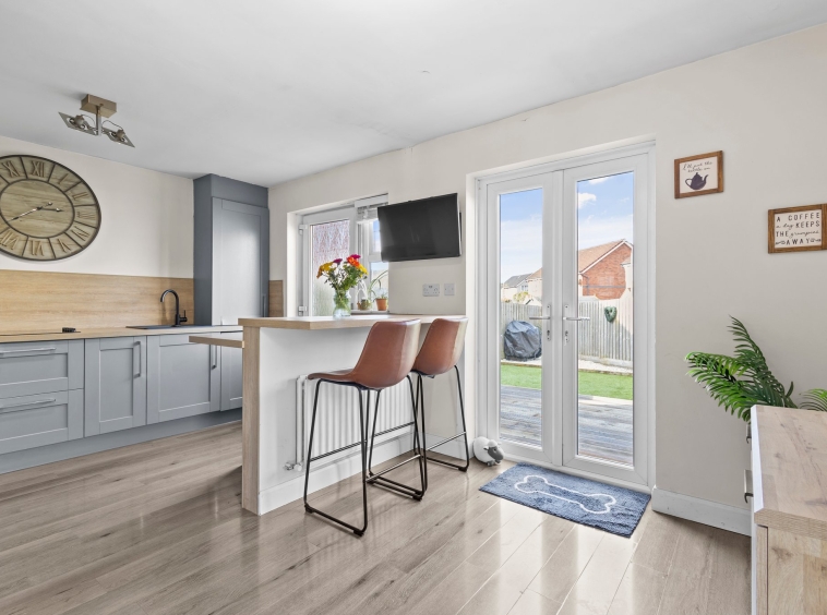 Fully fitted dining sized kitchen complete with stylish wall and base storage units, complimentary work surface, integrated oven, induction hob, microwave and wine cooler, neutral decor, practical breakfast bar seating area, plentiful space for a dining table and chairs, laminate flooring, a door to the rear and double glazed patio doors overlooking and giving access to the rear garden.
