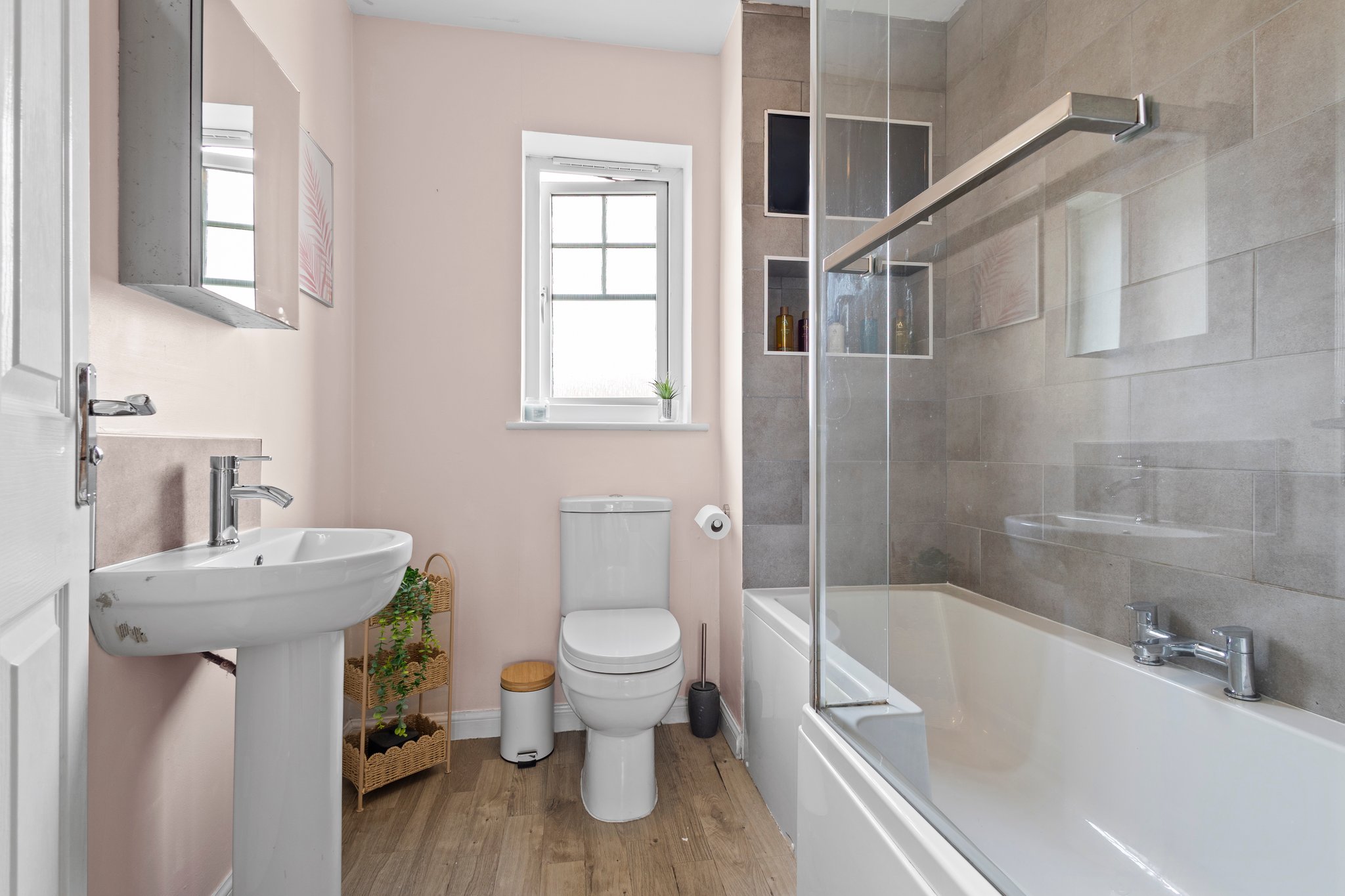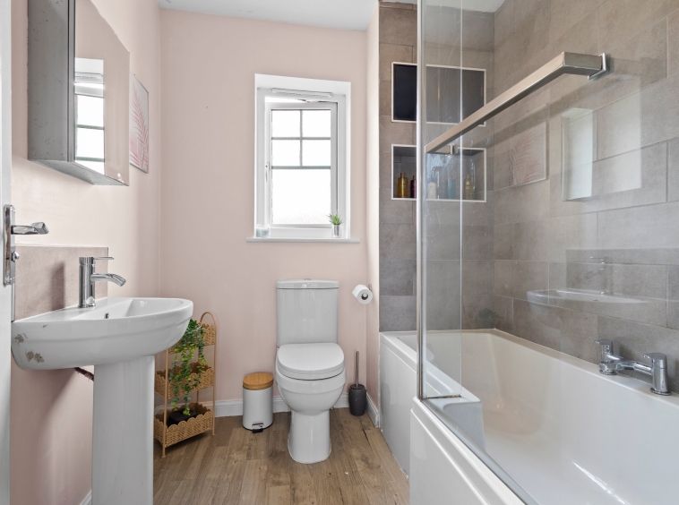 1.98m x 1.89m (6′ 6″ x 6′ 2″) Completing the accommodation is the family bathroom comprising of a wash hand basin, wc, bath with overhead shower, soft contemporary decor with a stylish tiled finish around the bath, vinyl flooring and a double glazed window to the rear.