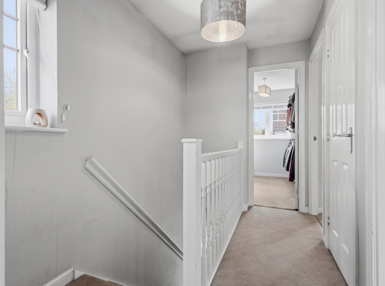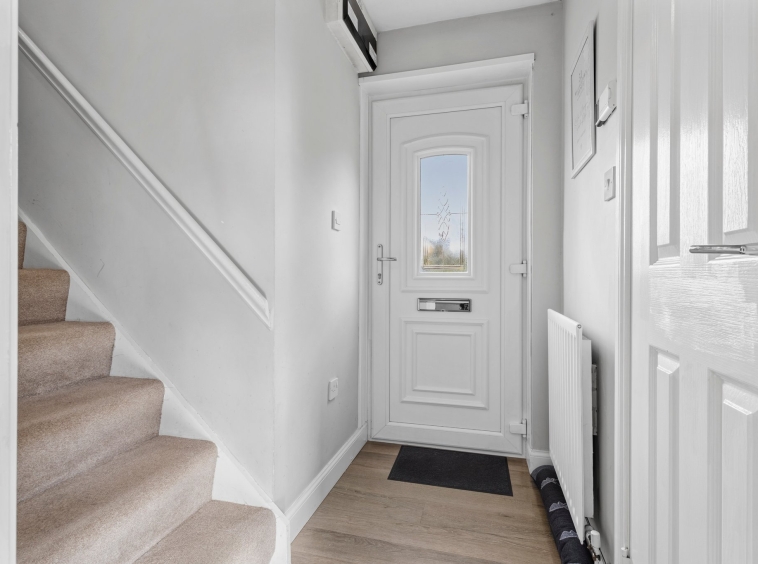 3.44m x 1.77m (11′ 3″ x 5′ 10″) Access is given to a welcoming entrance hallway offering neutral decor and laminate flooring. The hallway gives access to the lounge, wc and a carpeted staircase leads to the upper level.