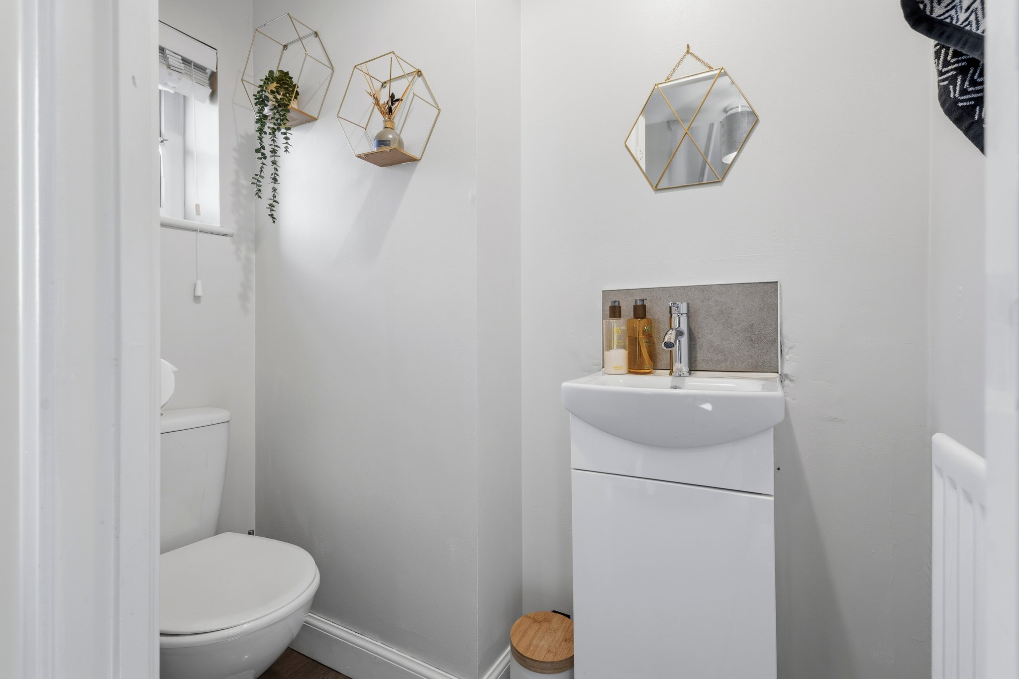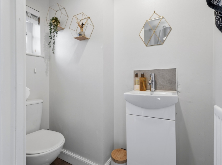 0.95m x 1.77m (3′ 1″ x 5′ 10″) Practical wc, conveniently located on the lower level comprising of a wash hand basin with vanity unit, wc, crisp white decor and laminate flooring.