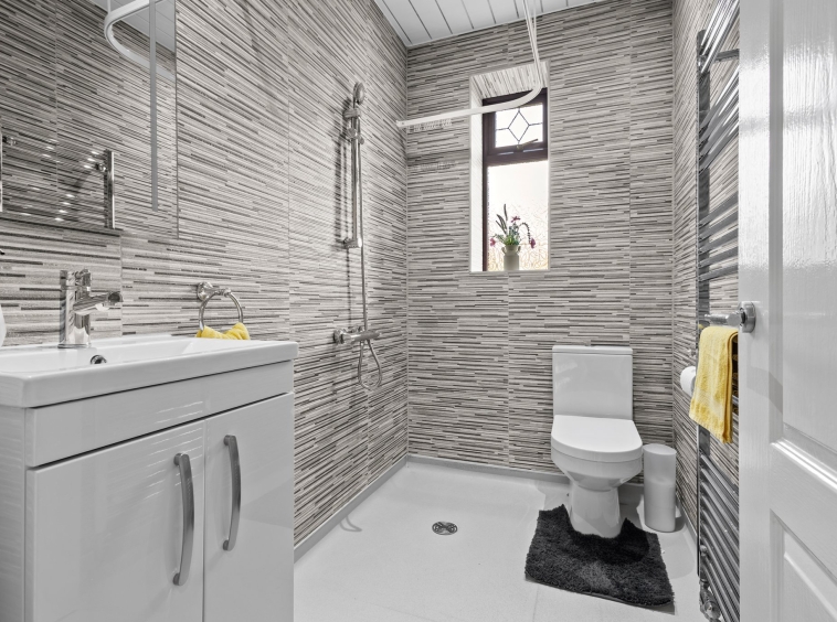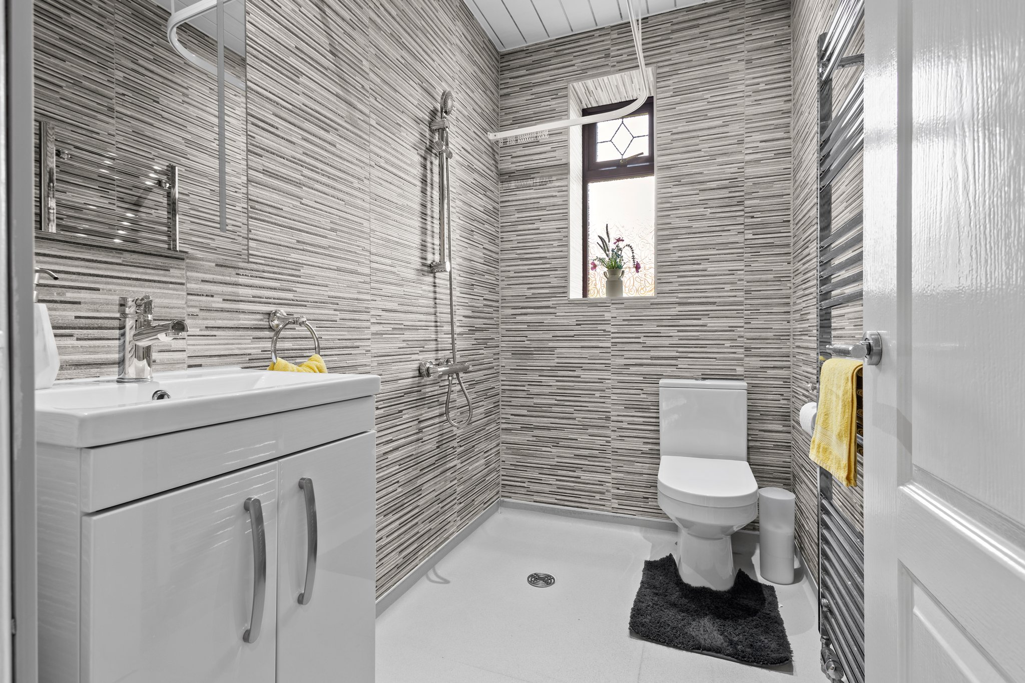 1.48m x 2.33m (4′ 10″ x 7′ 8″) Completing the accommodation is the three piece wet room suite comprising of a wash hand basin with vanity storage, wc and mains shower, chrome heated towel rail, wet wall finish, non slip vinyl flooring and a double glazed opaque window to the rear.