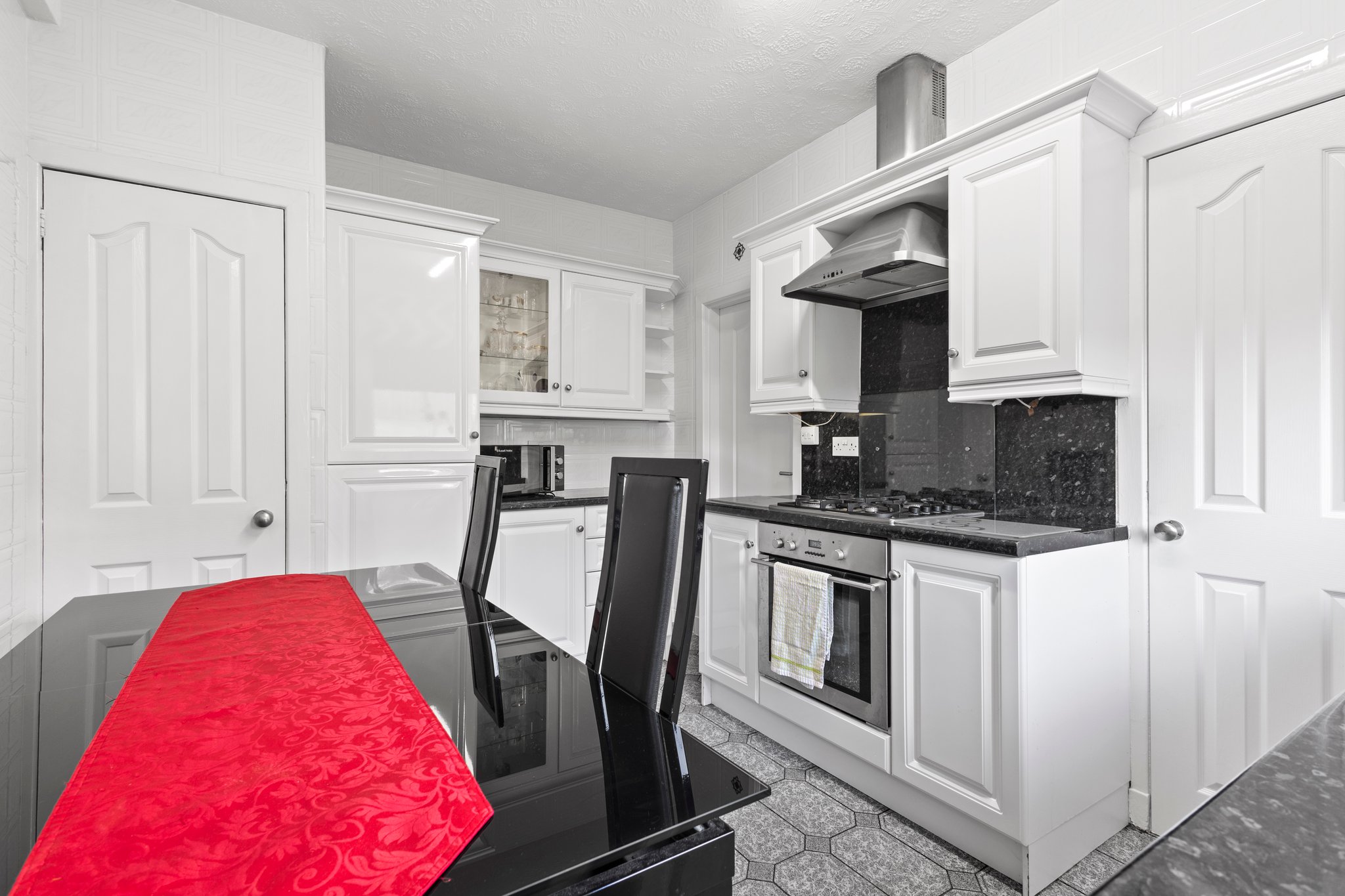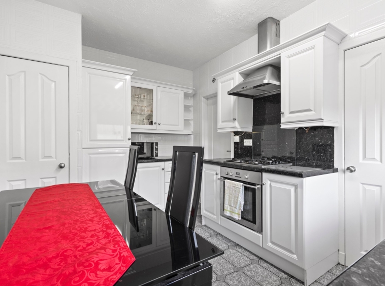 2.79m x 3.80m (9′ 2″ x 12′ 6″) Generous fitted kitchen offering a range of white wall and base storage units with contrasting anthracite work surfaces, integrated gas hob and cooker hood, electric oven, integrated fridge and freezer, plumbing space for washing machine, composite sink and drainer, crisp white tiled walls with anthracite splash back, tiled flooring, two storage cupboards, double glazed window to the rear and door leading out into the rear gardens.