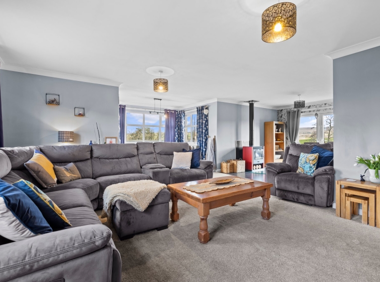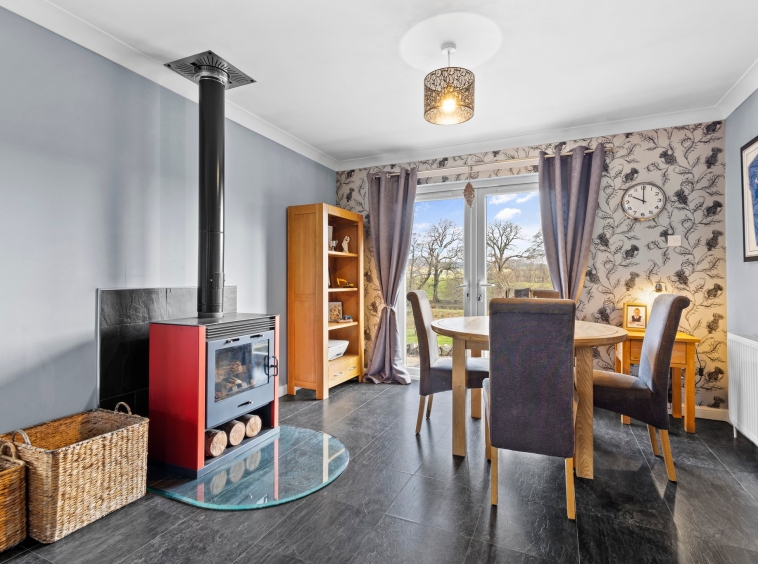 8.56m x 7.76m (28′ 1″ x 25′ 6″) The impressive open plan main living apartment provides an abundance of floorspace providing a generous lounge and a dining area offering tasteful decor with ceiling coving, fitted carpet in the lounge and laminate flooring in the dining area, and a feature wood burning stove. A range of double glazed windows to the front and side providing stunning open countryside views and allowing an abundance of light, French doors leading out into the rear gardens.
