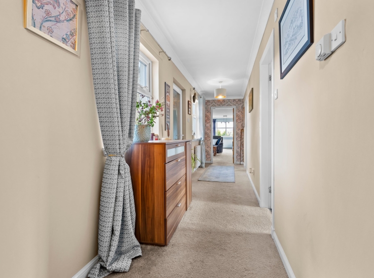 7.68m x 3.74m (25′ 2″ x 12′ 3″) The welcoming ‘L’ shaped entrance hallway provides door access to most apartments , complete with contemporary decor, fitted carpet and practical storage cupboard. Two double glazed windows to the front.