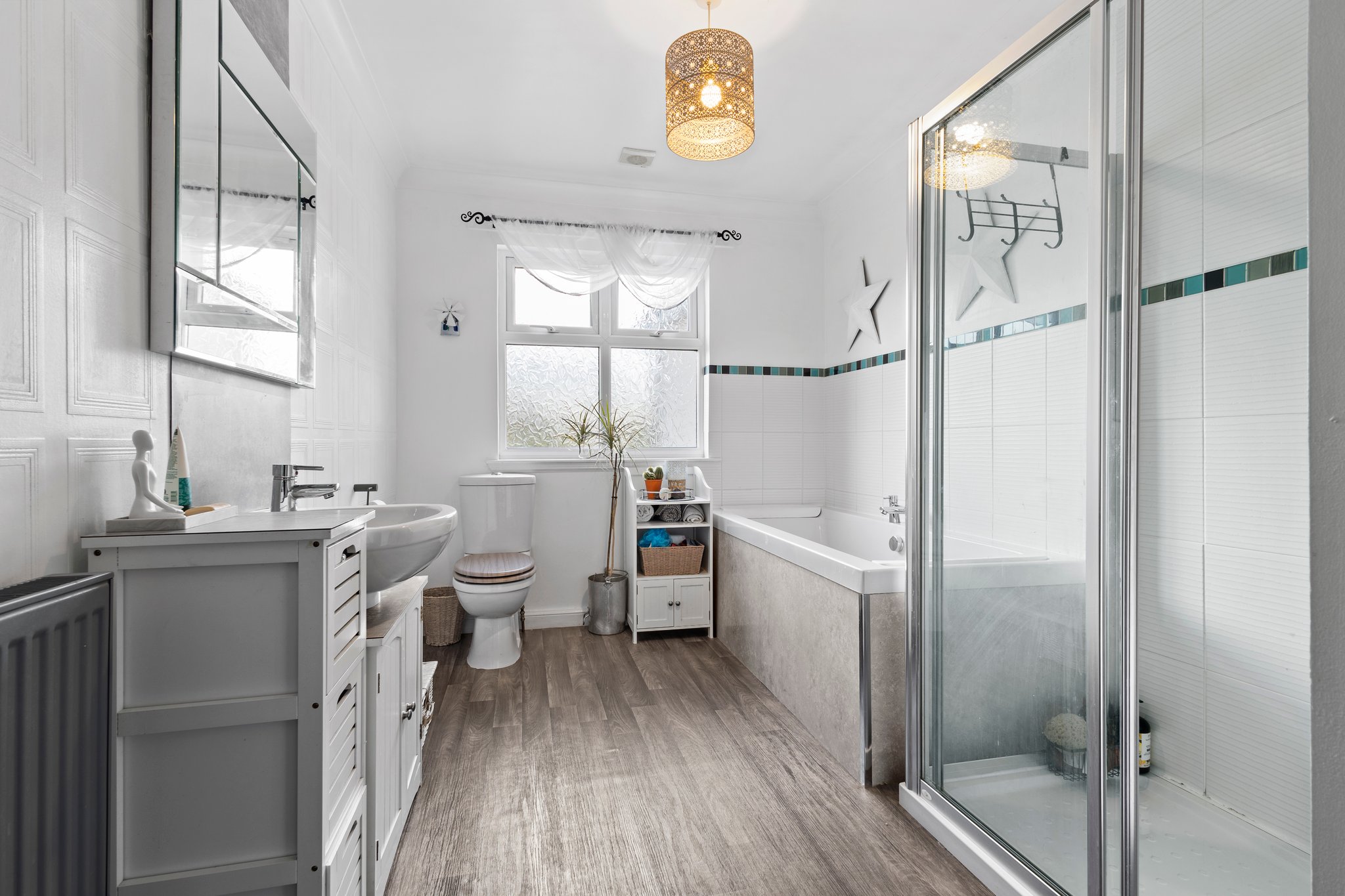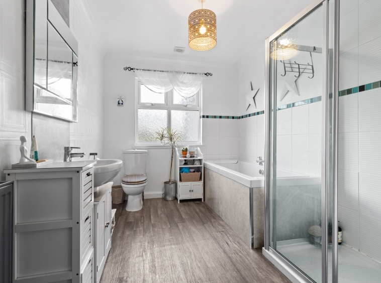 4.14m x 2.49m (13′ 7″ x 8′ 2″) Completing the accommodation is the four piece family bathroom suite comprising of a wash hand basin, wc, bath and shower cubicle with mains overhead shower. Modern decor with tiling to walls, vinyl flooring and double glazed opaque window to the rear.