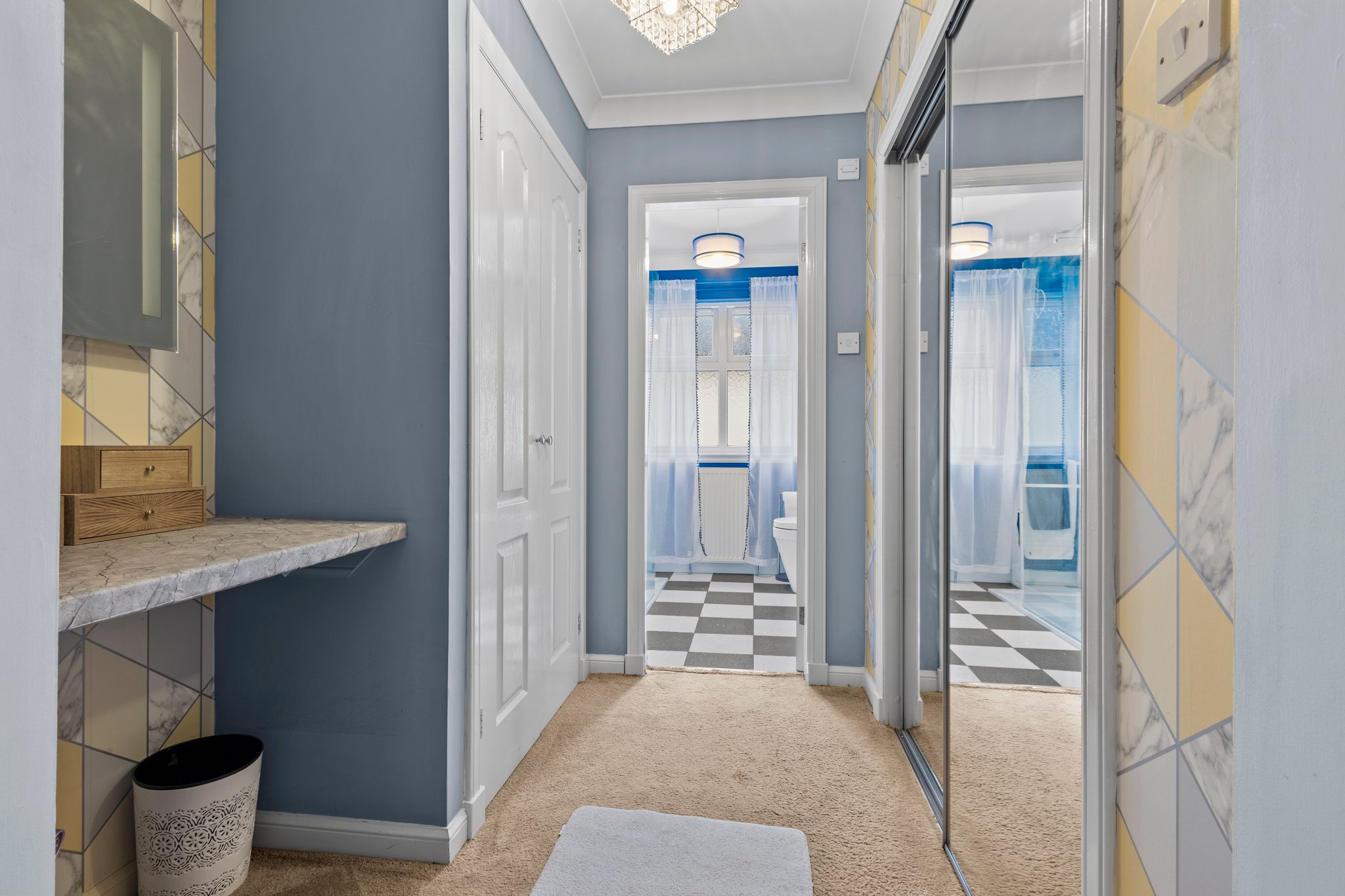 5.47m x 3.03m (17′ 11″ x 9′ 11″) The master bedroom is a sizeable double offering modern decor, ceiling coving and fitted carpet. Two double glazed windows to the rear with stunning outlooks, access into the enviable dressing area with fitted wardrobes and master en suite.