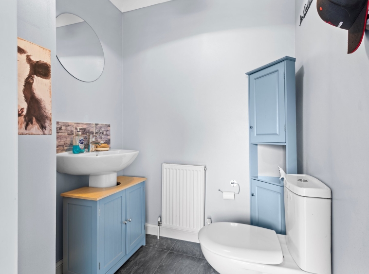 1.64m x 1.41m (5′ 5″ x 4′ 8″) Practical two piece cloaks/wc comprising of a wash hand basin and wc, with soft decor and laminate flooring.