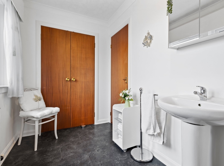 3.17m x 1.90m (10′ 5″ x 6′ 3″) Sizeable, larger than average two piece cloaks/wc comprising of a wash hand basin and wc set, with neutral decor, vinyl flooring and front facing double glazed opaque window. Generous storage cupboard.