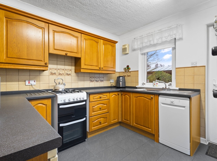 3.04m x 3.03m (10′ 0″ x 9′ 11″) Spacious fitted kitchen offers a range of wall and base storage units with complementary work surfaces, stainless steel sink and drainer, plumbing/space for appliances including cooker, fridge/freezer and dishwasher. Neutral decor, tiled flooring, double glazed window to the rear and door leading out into the gardens.